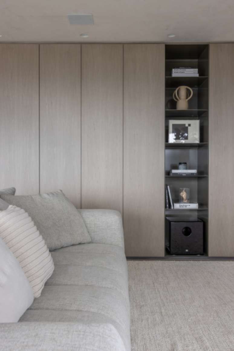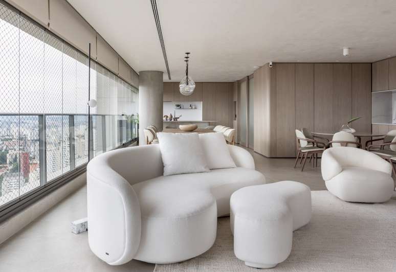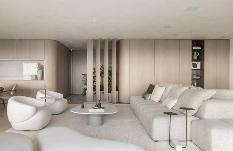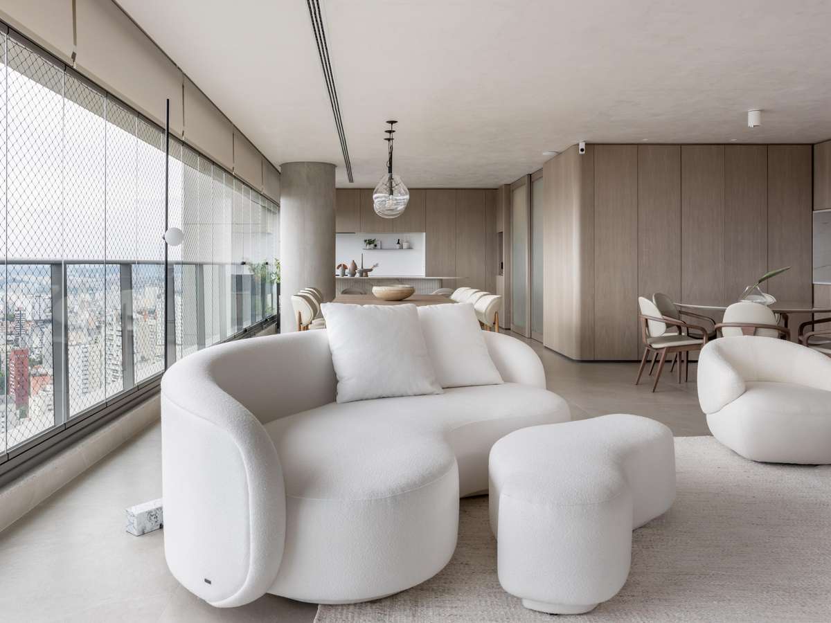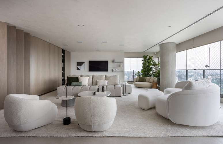 Os painéis de madeira em folha de grey wood com cantos curvos abraçam toda a extensão do living, brises, estante de serralheria e nicho de pedra. Sofás e poltronas confortáveis e em tons claros são convidativos a se jogar e apreciar a vista do 32º andar.