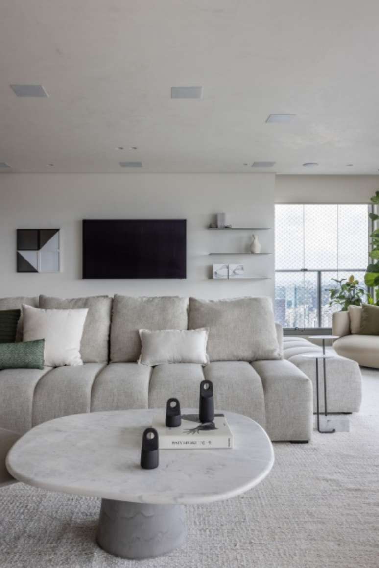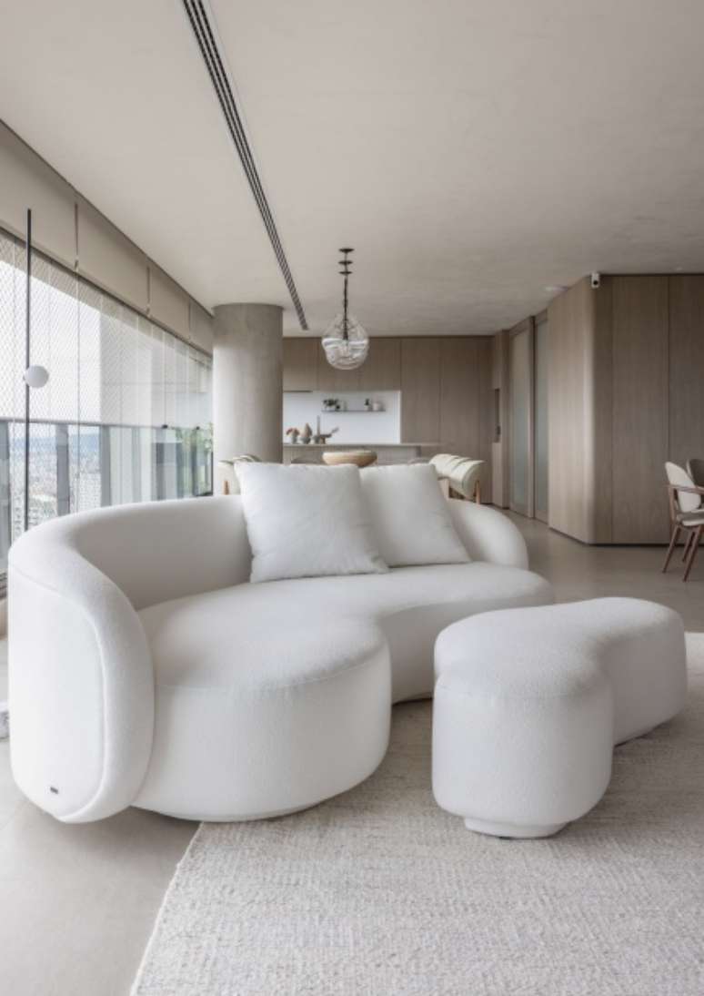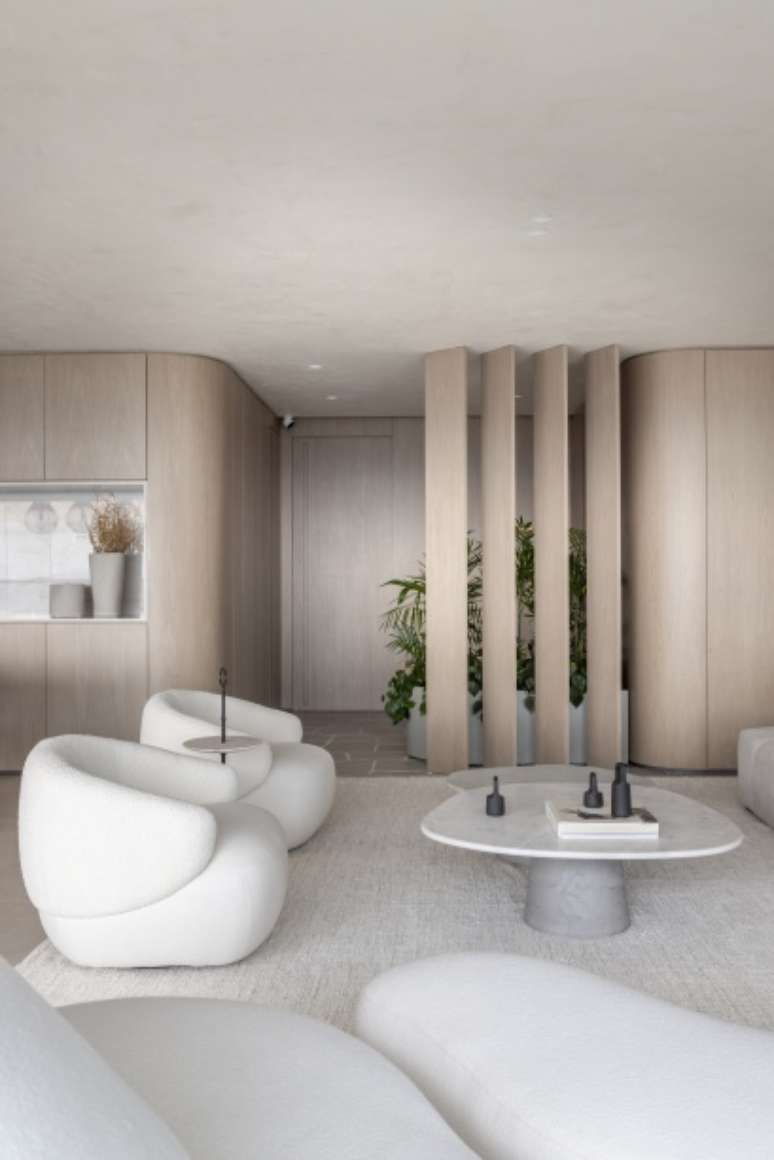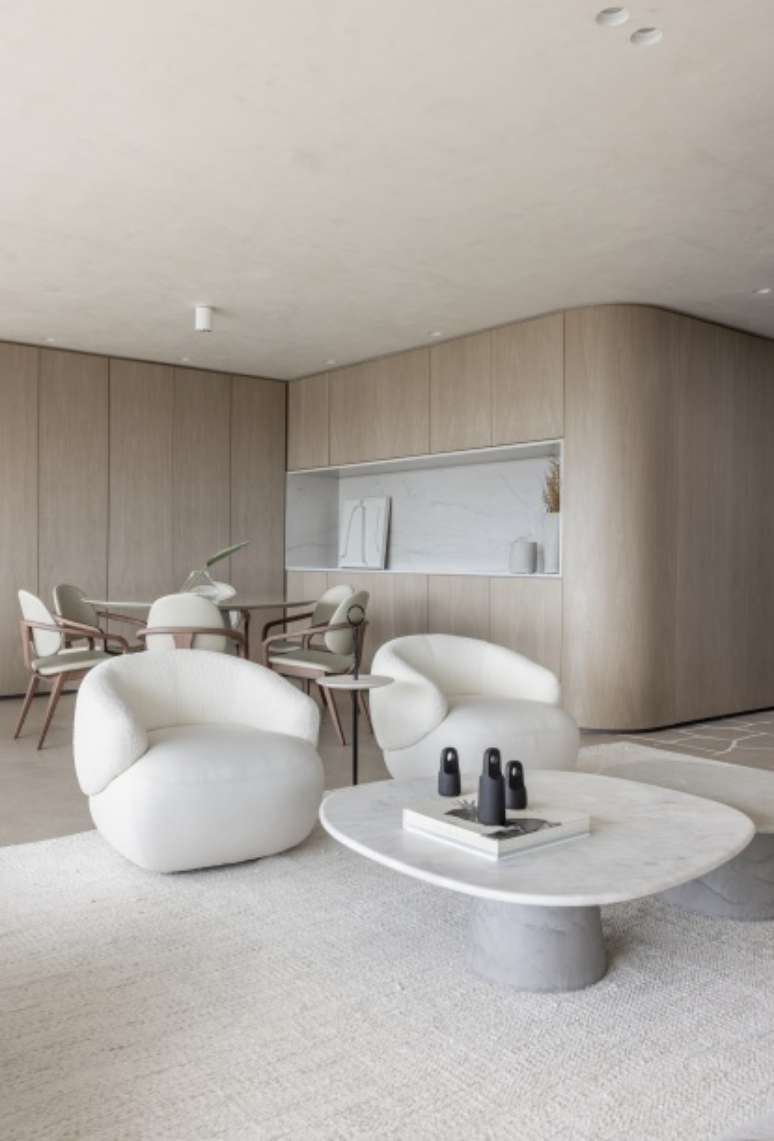Os painéis de madeira em folha de grey wood com cantos curvos abraçam toda a extensão do living, brises, estante de serralheria e nicho de pedra. Sofás e poltronas confortáveis e em tons claros são convidativos a se jogar e apreciar a vista do 32º andar.
