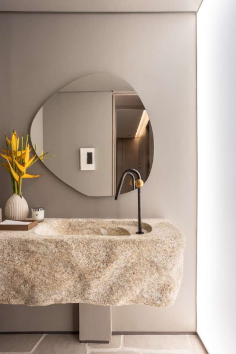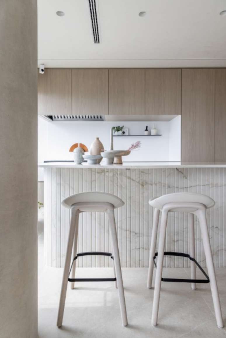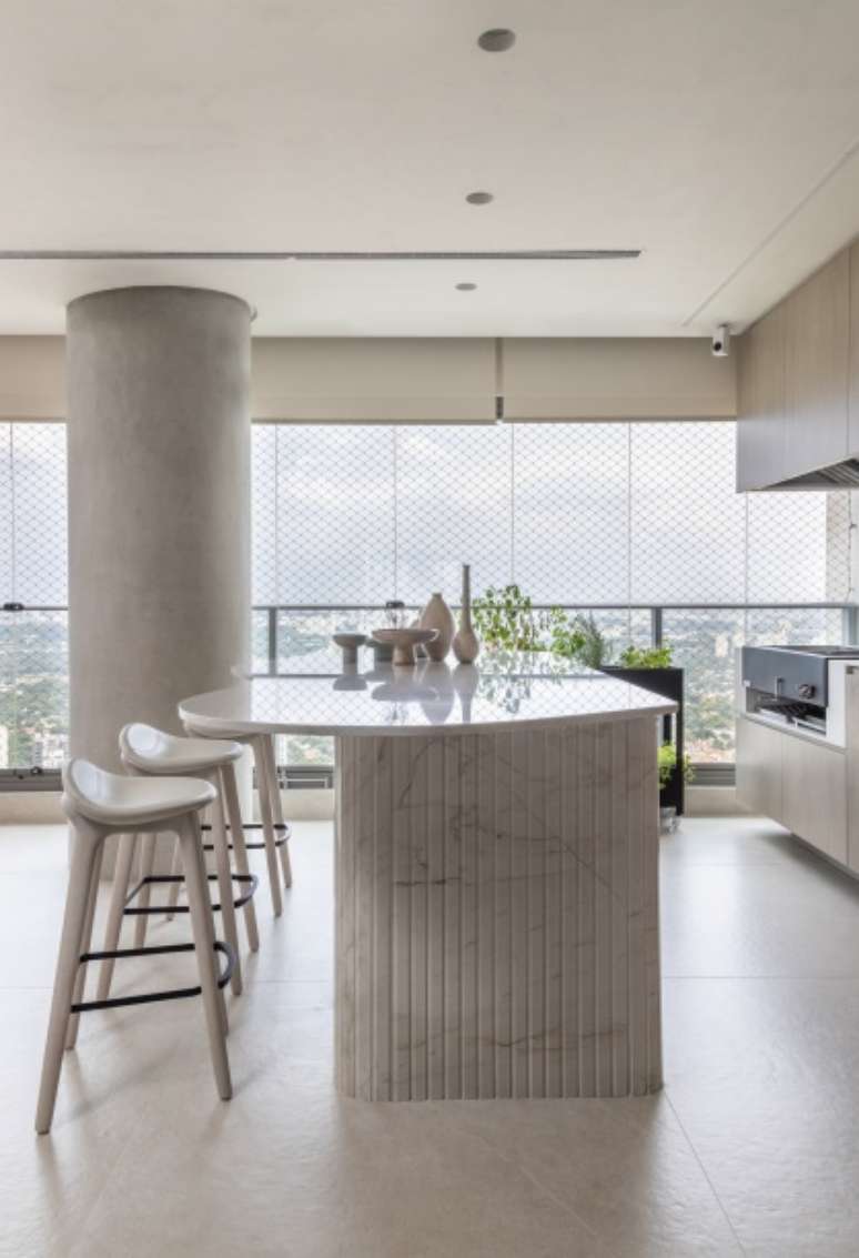 O espaço gourmet ganhou uma ilha com tampo em formato orgânico e base ripada de quartzito. Já na bancada da churrasqueira, a marcenaria esconde a coifa feita sob medida.