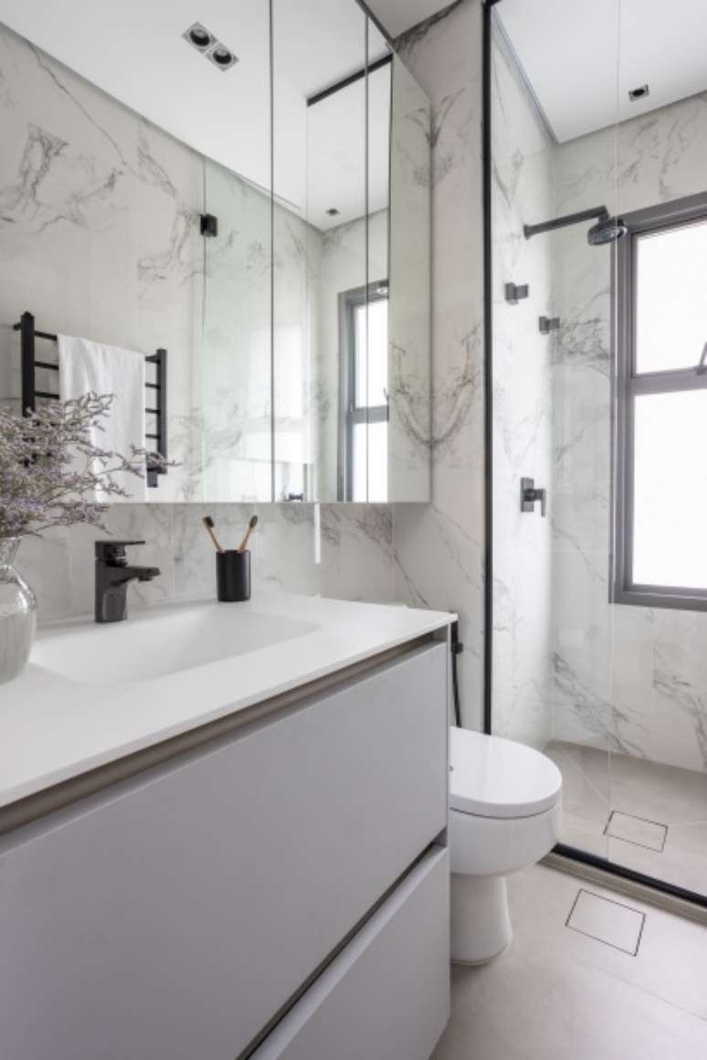 Na reforma, o hall do elevador foi integrado à entrada do apartamento, a esquadria da varanda foi retirada e o living, gourmet e jantar viraram um único ambiente. Uma porta de correr oculta na marcenaria separa a cozinha da área social.