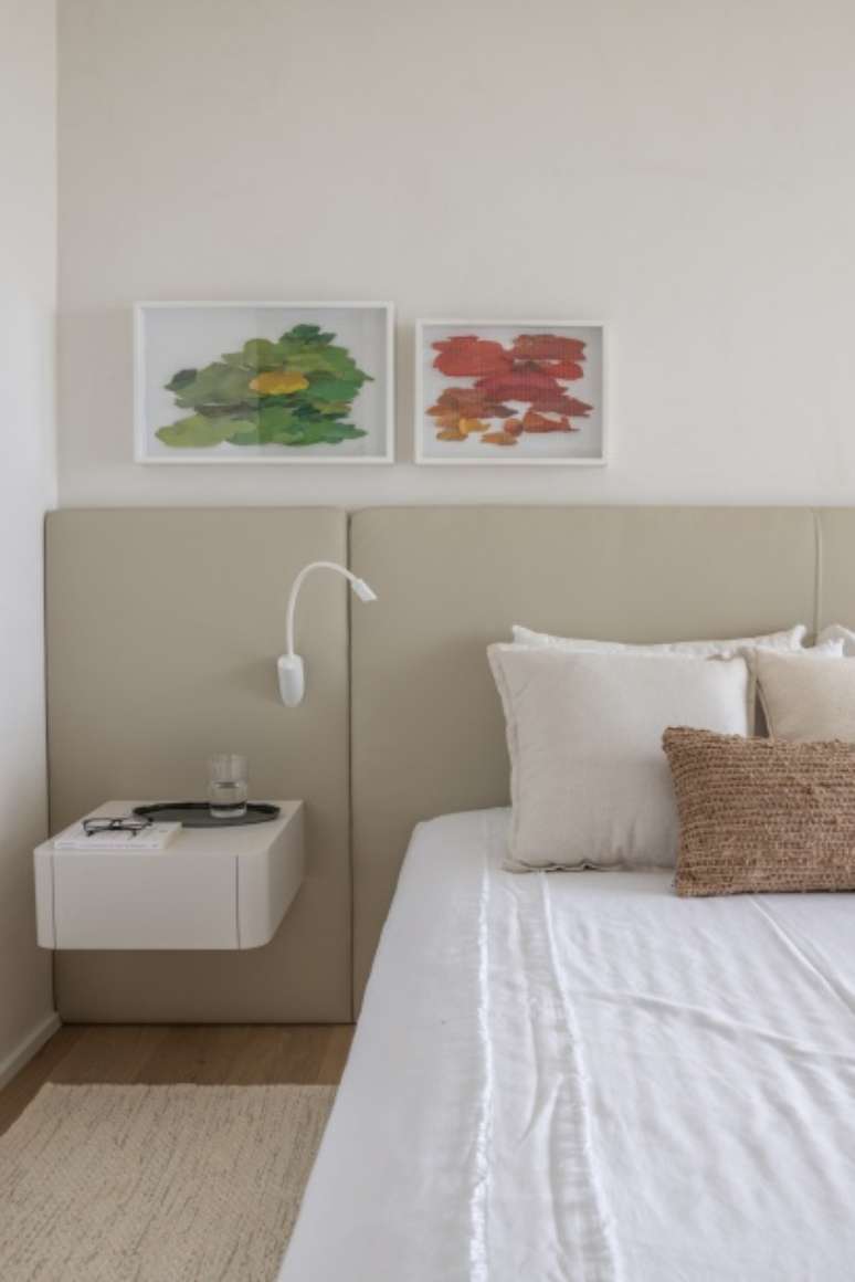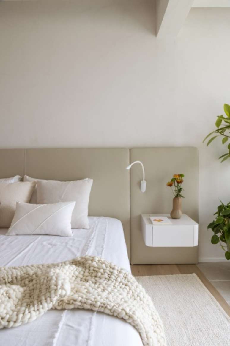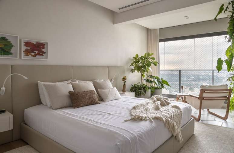 Por fim, a suíte máster ganhou uma atmosfera tranquila com materiais em tons claros, paredes e forro de cimento queimado, painel de cabeceira e cama estofados com couro, tapete tramado em cor clara e marcenaria de laca off white.