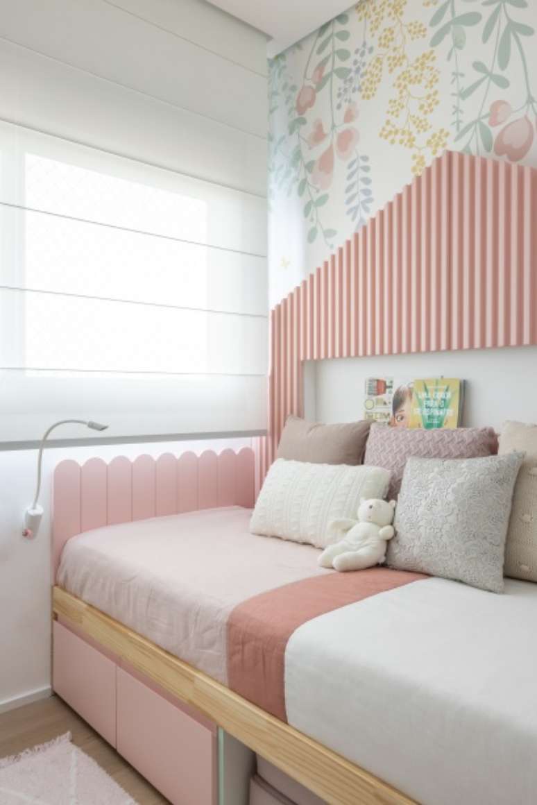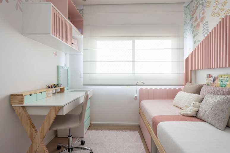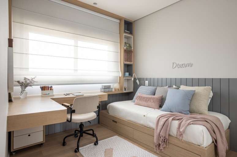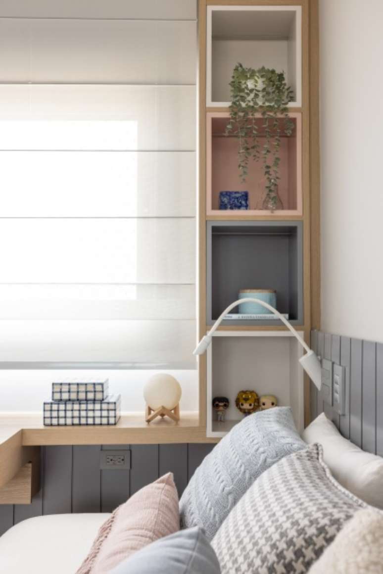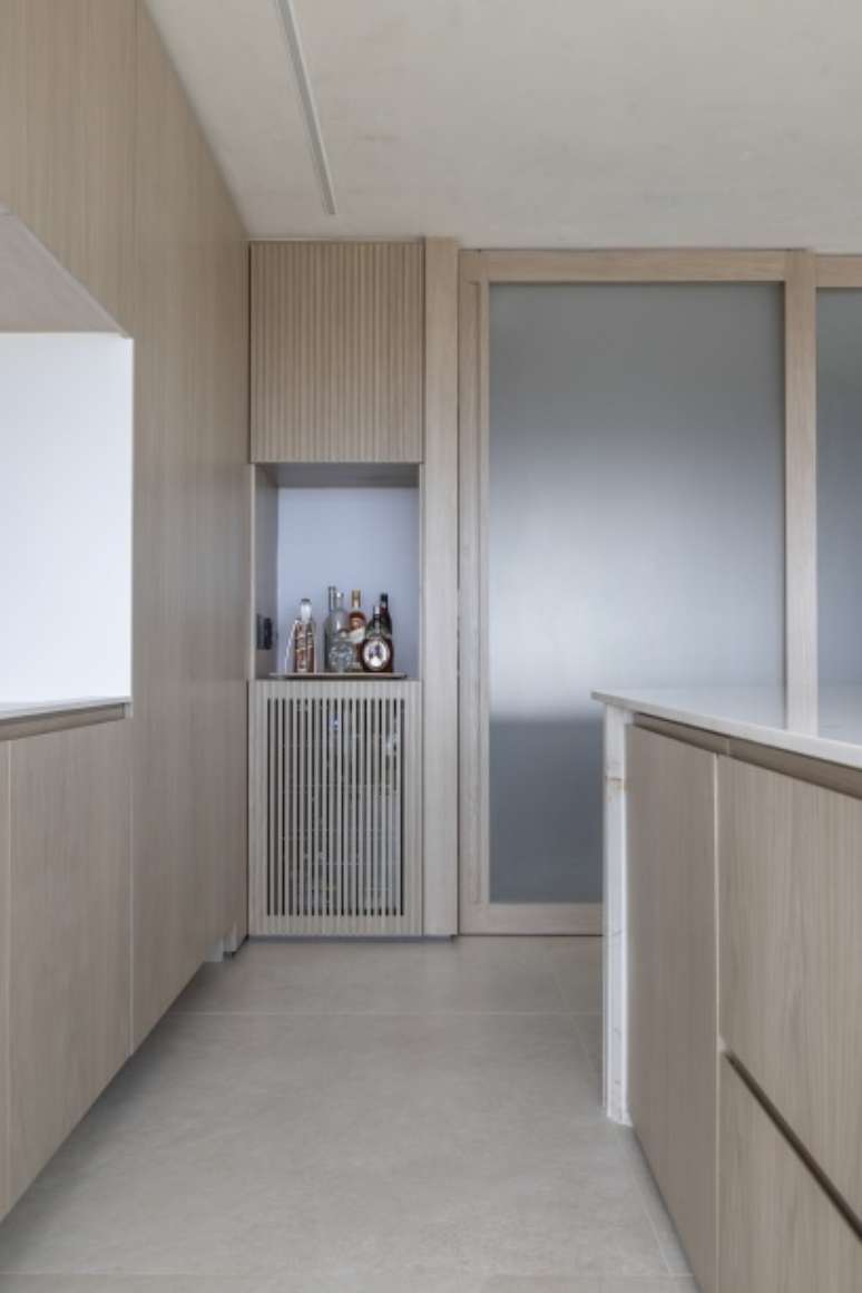 A marcenaria permeia todo o apartamento: painéis, muitos armários para armazenamento e passagens exibem a madeira, mas com toques diferenciados em cada espaço. No hall, por exemplo, os brises giratórios dão um pouco mais de privacidade, despertam a curiosidade de quem entra e também permitem a passagem de luz. A porta de entrada é pivotante e foi revestida com folhas de madeira, ficando camuflada nos painéis.