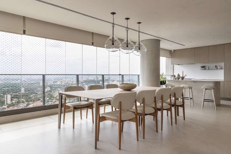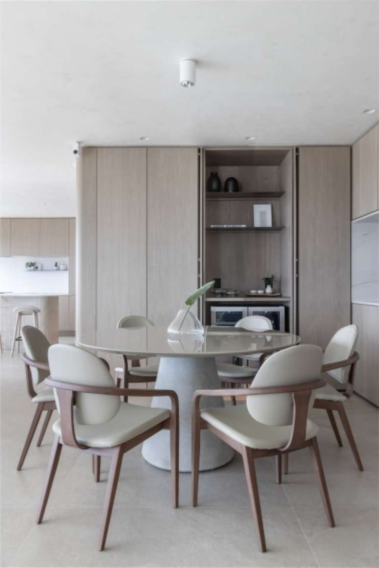 O sofá-ilha cria um ambiente de home theater e um de estar. A mesa redonda no dia a dia funciona como uma mesa de jogos para a família e, em ocasiões quando os proprietários recebem mais convidados, vira uma extensão do jantar, assim como o nicho se faz de buffet.