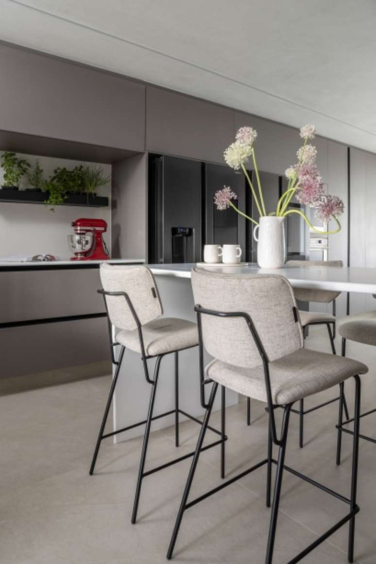 O layout da cozinha conta com uma grande bancada em U de corian, com o cooktop posicionado com vista para área social - ou seja, a pessoa que estiver cozinhando no lado oposto da bancada não fica isolada dos convidados em dias de visita.