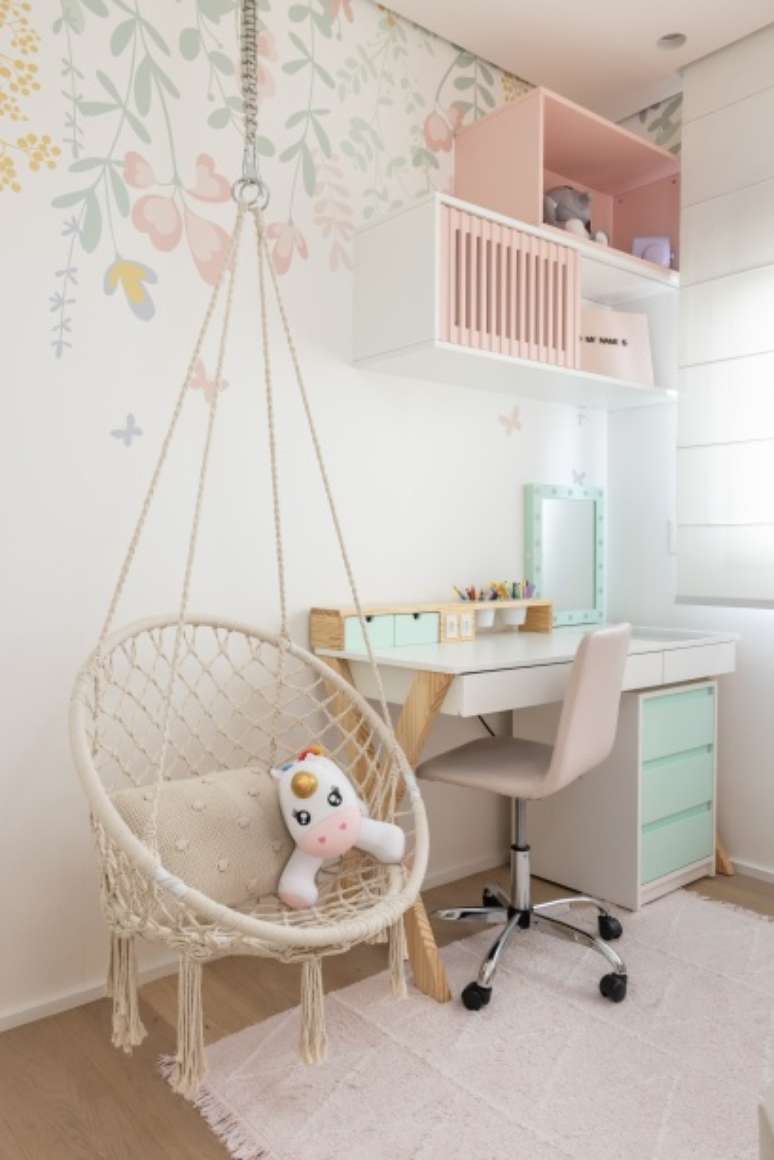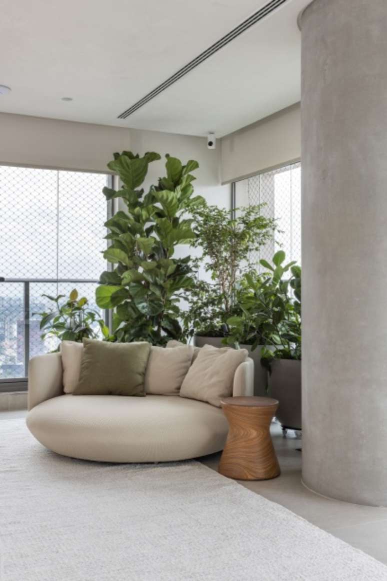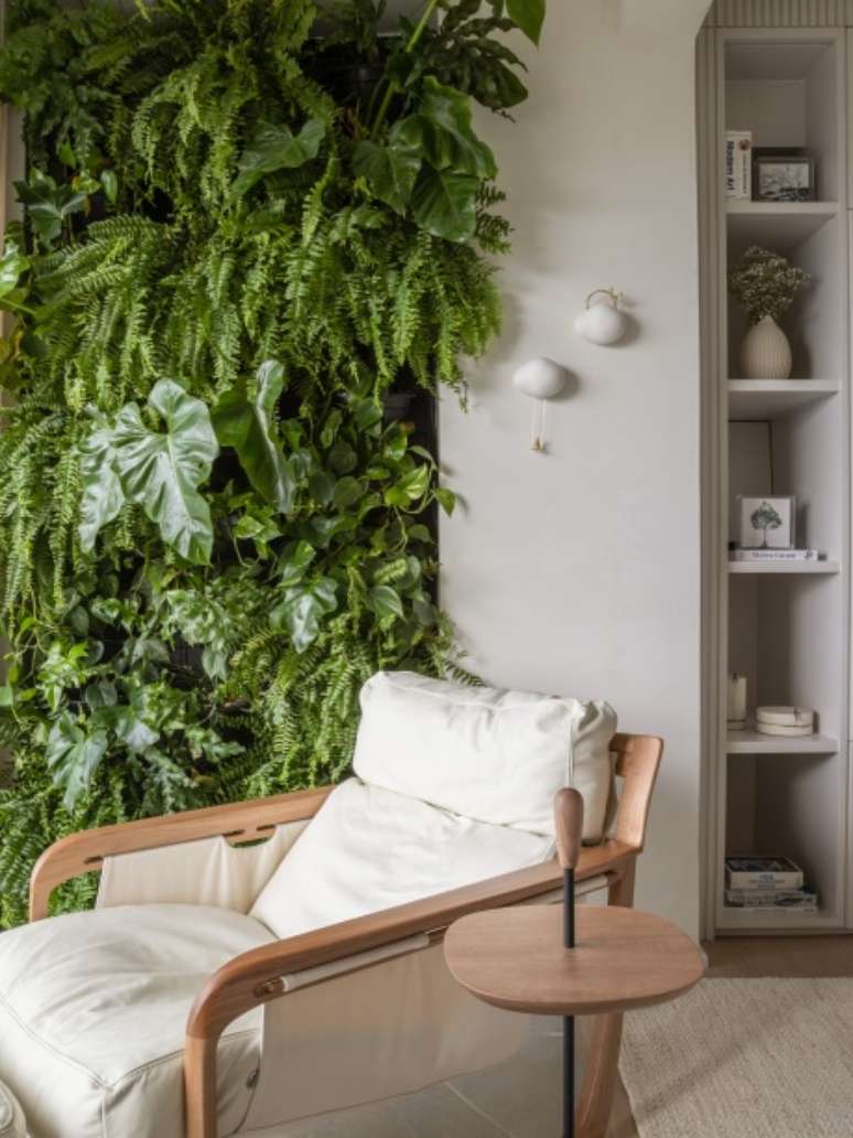 O cantinho de leitura com uma poltrona redonda juntamente com o paisagismo assinado por Bia Abreu ficou super aconchegante e traz um pouco do verde para o ambiente. Na parede da TV, para não poluir o décor, todos os equipamentos e subwoofer foram colocados no armário ao lado da estante de serralheria.