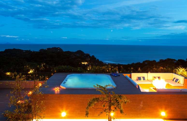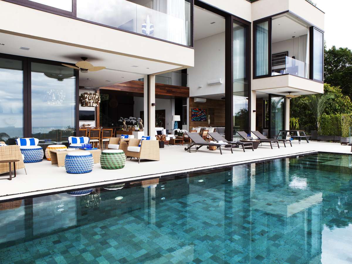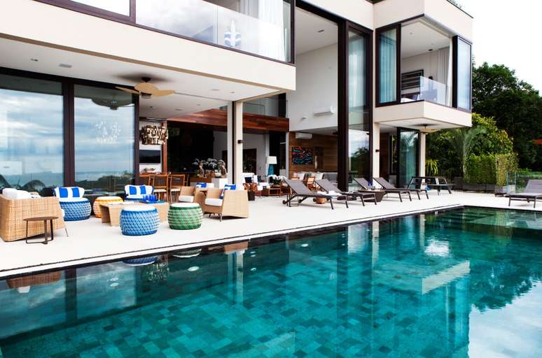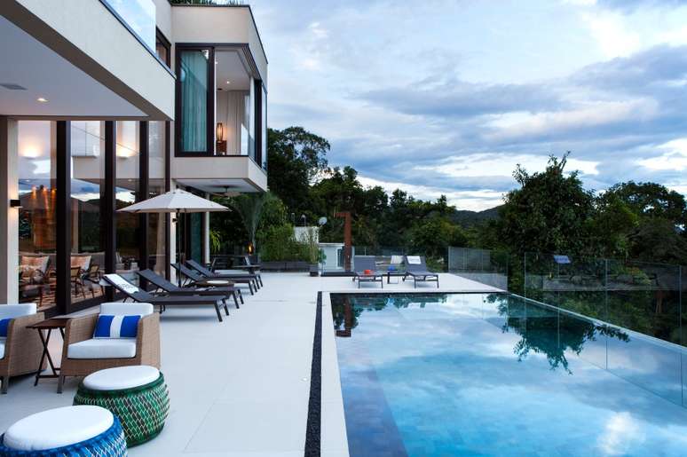 O projeto da piscina é outro destaque da casa de tirar o fôlego. Medindo 11.40 x 4.00 m, todo o fundo e suas laterais foram revestidos com a pedra natural (Palimanan), um material duradouro e que mantém a água sempre aquecida. Alocada na extremidade mais íngreme do terreno, sua borda infinita passa a sensação mágica de se poder tocar o mar.