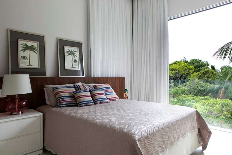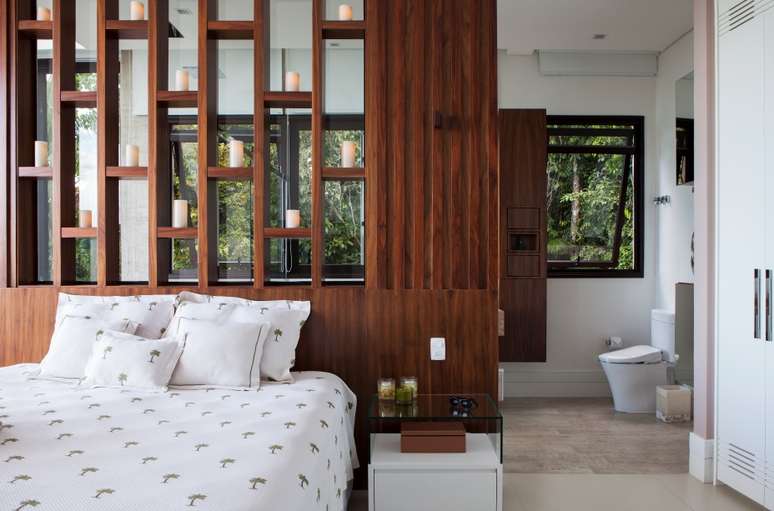 A suíte principal é cheia de detalhes e se tornou um verdadeiro convite para relaxamento. A cabeceira foi projetada em madeira, com elementos vazados que vão até o teto, além do efeito decorativo, a solução traz privacidade para a área do banho, que conta com uma hidromassagem posicionada para a Mata Atlântica preservada ao redor e para o mar.
