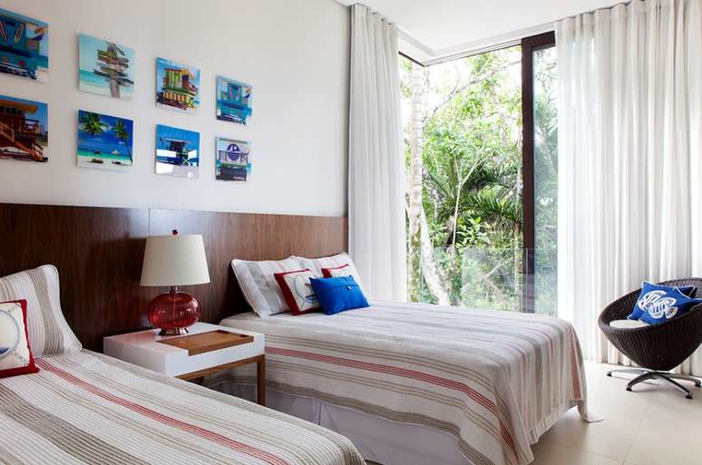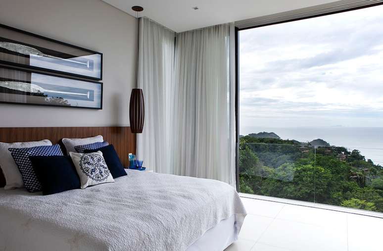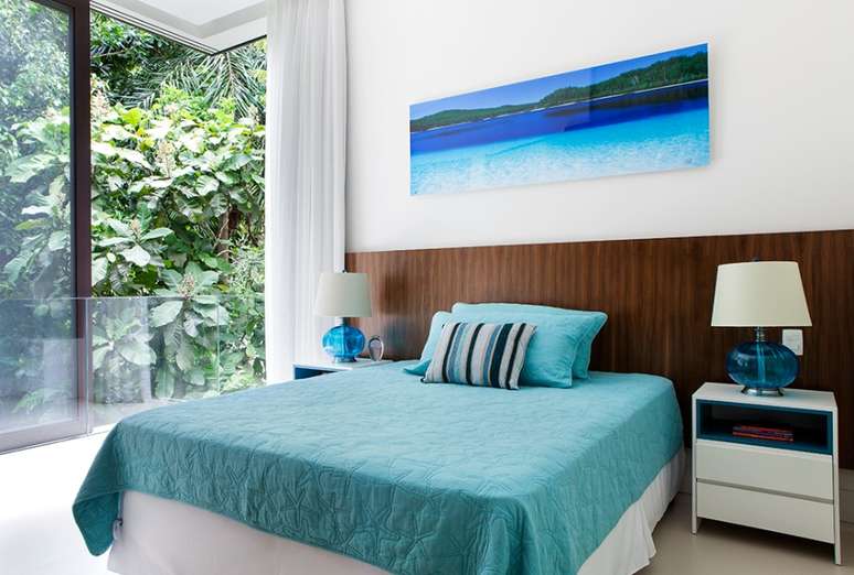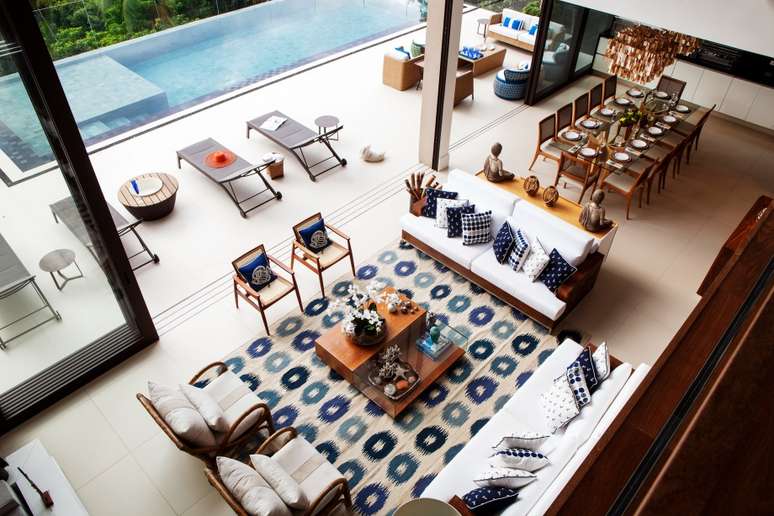 O posicionamento dos sofás possibilita a interação da família e convidados, assim como a contemplação da natureza ao redor. "Para o mobiliário, trabalhamos com a madeira maciça, material nobre que se compõe com o perfil da casa", revela Giseli. Na decoração, a designer de interiores optou por cores tradicionais de casas de praia: branco e azul, que casam muito bem com o despojamento e a luminosidade dos espaços à beira-mar.