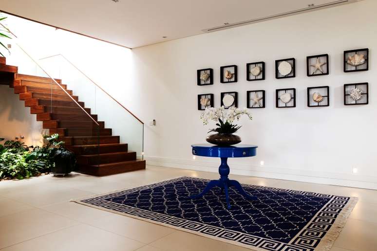 Como os proprietários são apaixonados por conhecer o mundo e registrar as memórias afetivas com objetos comprados durante as viagens, a designer de interiores fez questão de dedicar um espaço para essa disposição. Acompanhado pelo azul do tapete geométrico e o estilo clássico da mesa de centro, as paredes receberam molduras com conchas trazidas do Vietnã.
