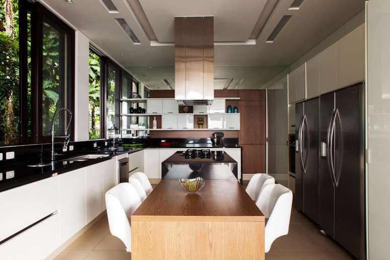 Integrada com a Mata Atlântica e o mar, a cozinha se insere neste contexto para trazer e reforçar um espaço agradável a fim de receber os convidados no momento de degustação.