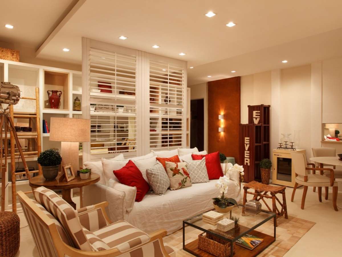 Sala e Cozinha do Casal, ambiente criado pela designer de interiores Andressa Fonseca. Nele, um sistema automático controla a intensidade da luz para economizar energia. O sistema de som pode ser controlado por um iPod