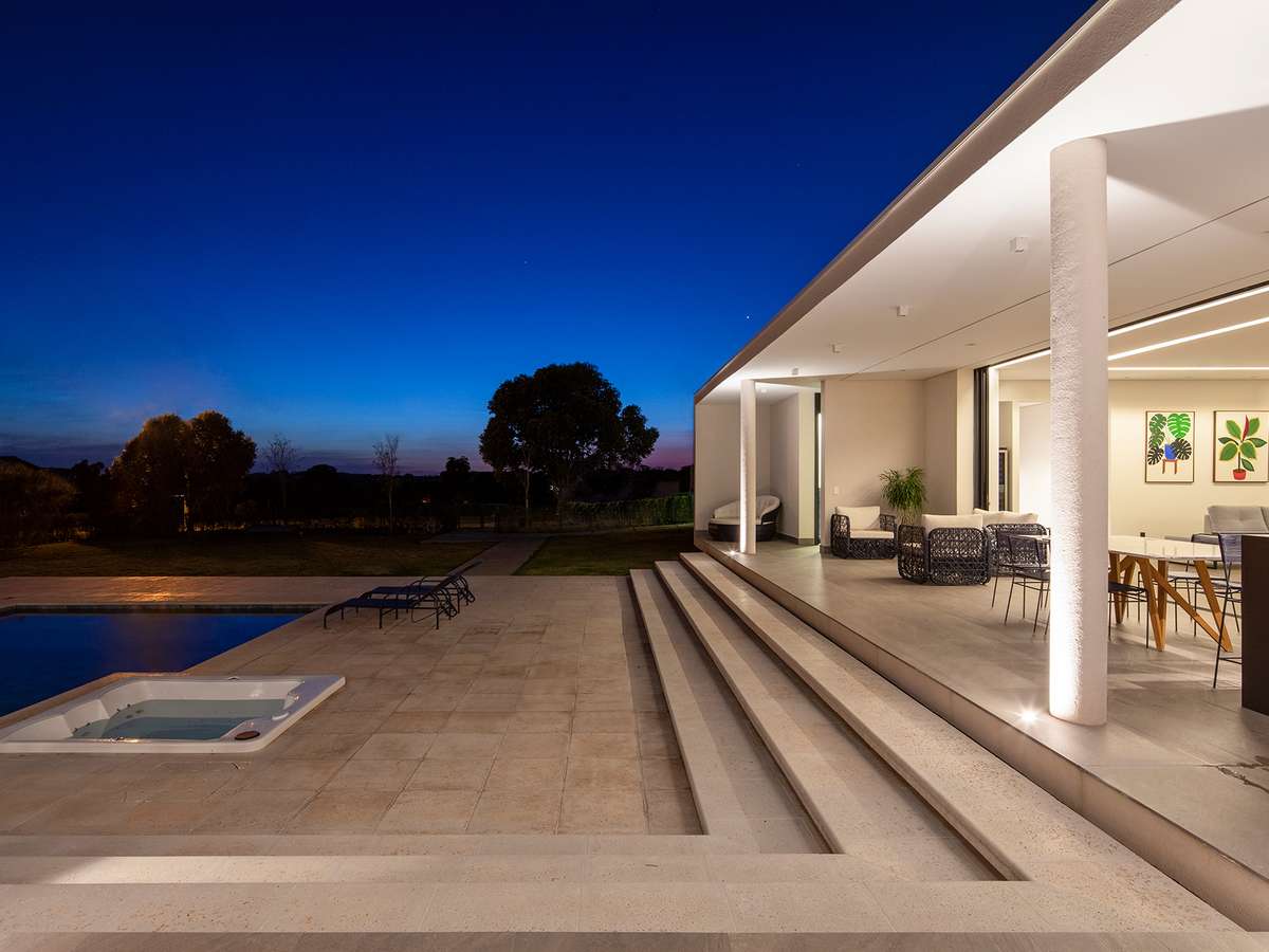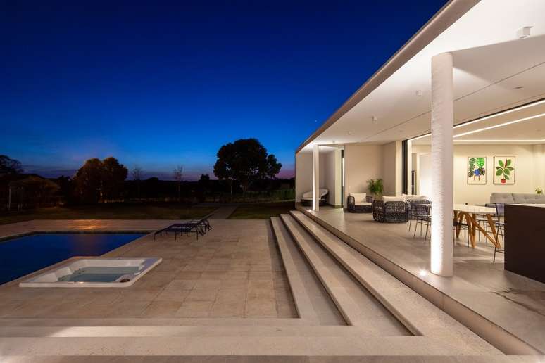 Para a frente, voltada para a piscina, foram criados desníveis, incluindo uma escada que funciona também como área de convívio.