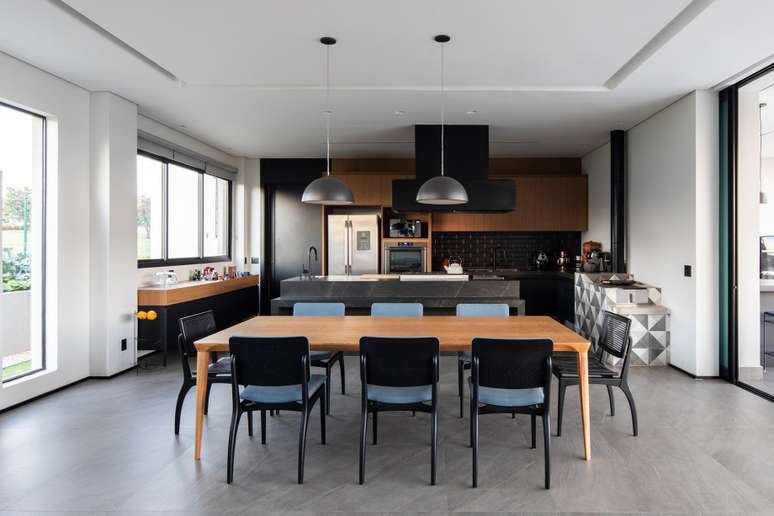 A paixão da esposa do casal por gastronomia inspirou o conceito da cozinha gourmet completa, equipada com ilha e forno a lenha.