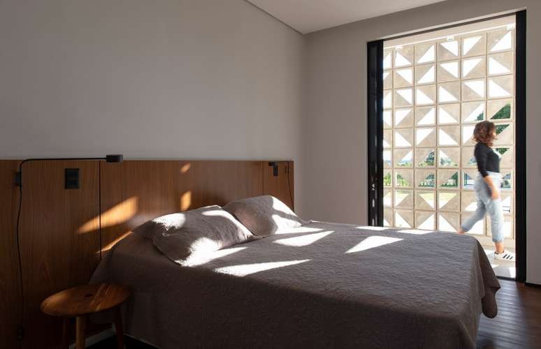 Na área íntima dos proprietários, os quartos do casal e dos filhos estão isolados - o que garante o descanso tranquilo dos usuários. Um elemento vazado foi estrategicamente aplicado na superfície, em frente aos quartos, com o objetivo de alcançar privacidade extra e proteção solar.