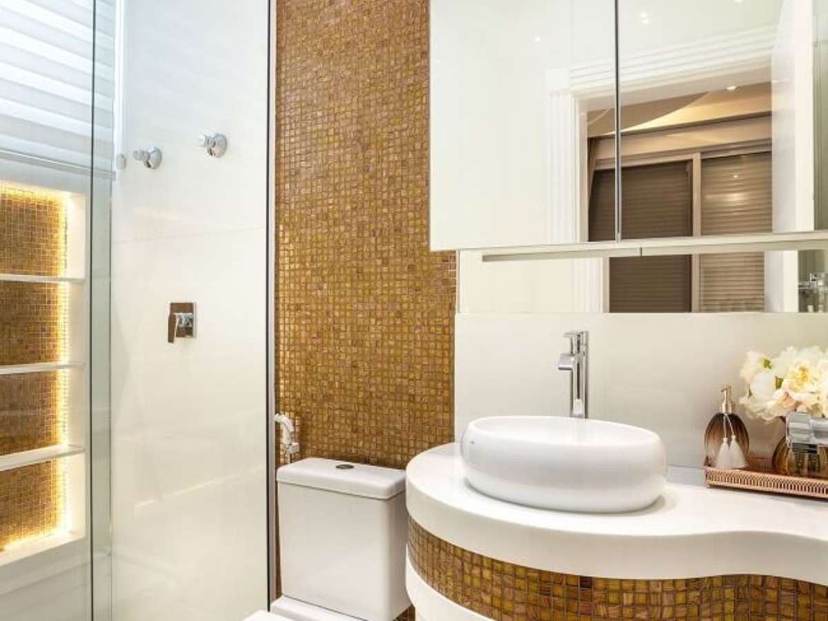 Se a ideia é criar um ambiente ainda mais elegante e sofisticado, a dica é apostar na faixa decorativa para banheiro vertical que se estende para o tampo da bancada de banheiro. No projeto abaixo, as pastilhas de vidro em tom dourado formam uma linda faixa decorativa vertical que se estende até o tampo da bancada. Observe que sobre a faixa do tampo, bandeja de madeira e acessórios para banheiro ganharam um destaque especial.