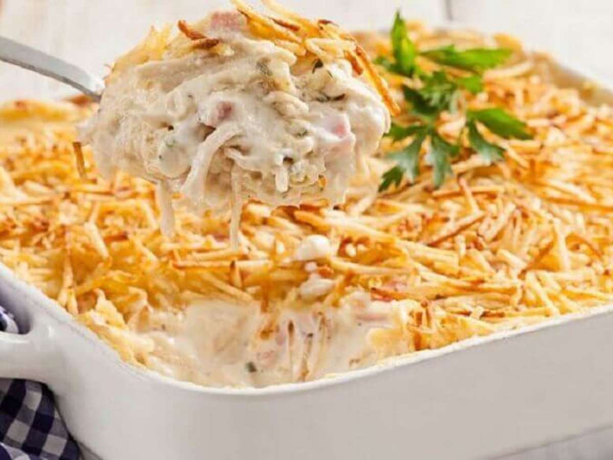 - Em seguida, adicione a batata palha sobre o queijo e leve novamente ao forno por mais ou menos 15 minutos, ou até você perceber que seu fricassê de frango cremoso está gratinado e dourado.