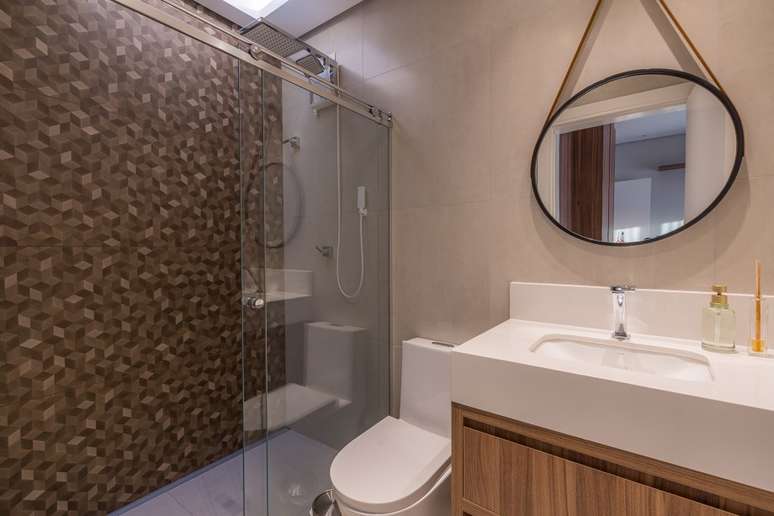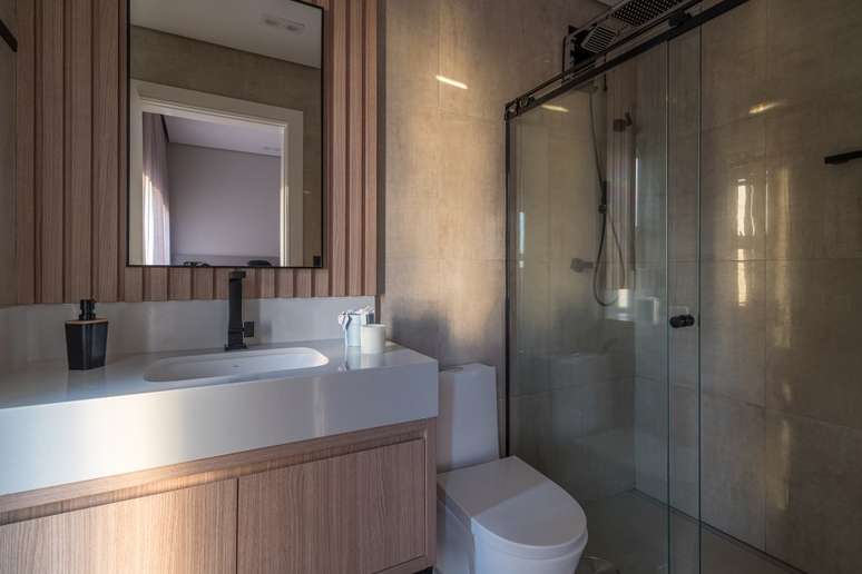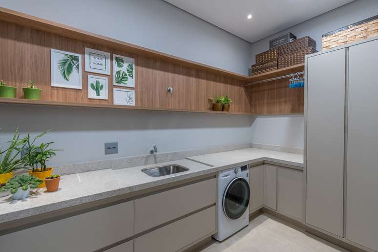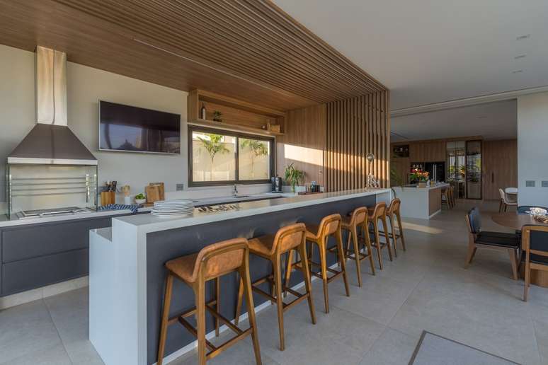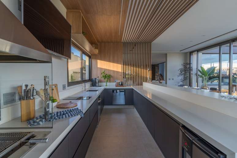 A cozinha, totalmente integrada às salas de jantar e living, é um convite à confraternização familiar, com destaque para o revestimento de madeira com detalhes ripados. O lavabo espaçoso foi pensado para receber cadeirantes e portadores de necessidades.