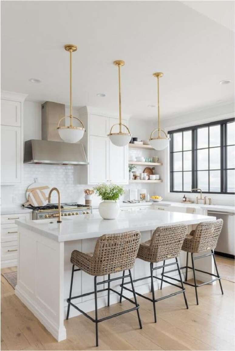 15. Bancada e ilha feita de granito claro com armário branco – Foto Arkpad