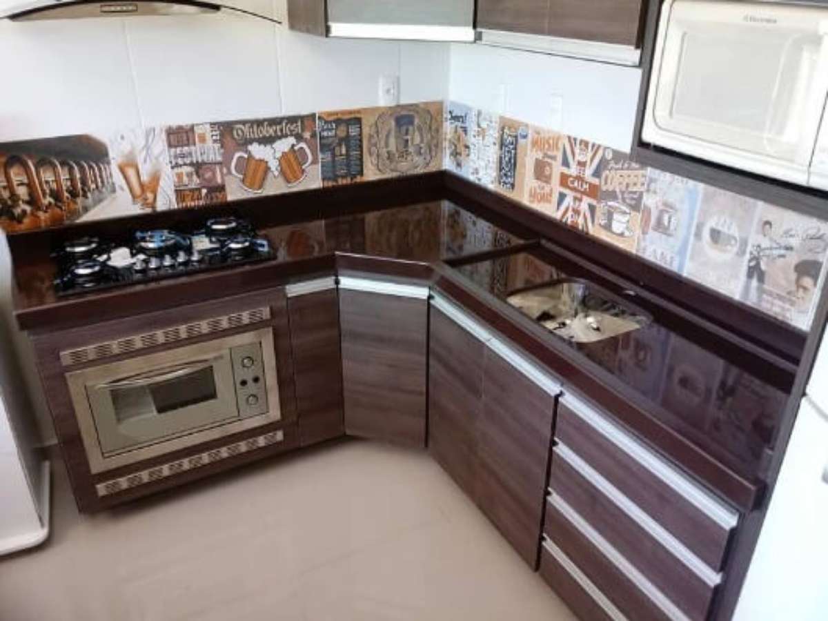A decoração da cozinha deve ser harmoniosa, principalmente se o espaço for compacto. Opte por utilizar tons próximos ao marrom que combinem com a bancada de granito marrom absoluto.