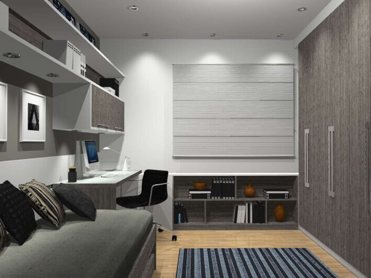 Abaixo você pode conferir a decoração de um quarto de solteiro pequeno com estilo bem moderno onde o tom de cinza domina o ambiente e o guarda roupa solteiro porta de correr recebeu espelho para deixar o ambiente ainda mais moderno.