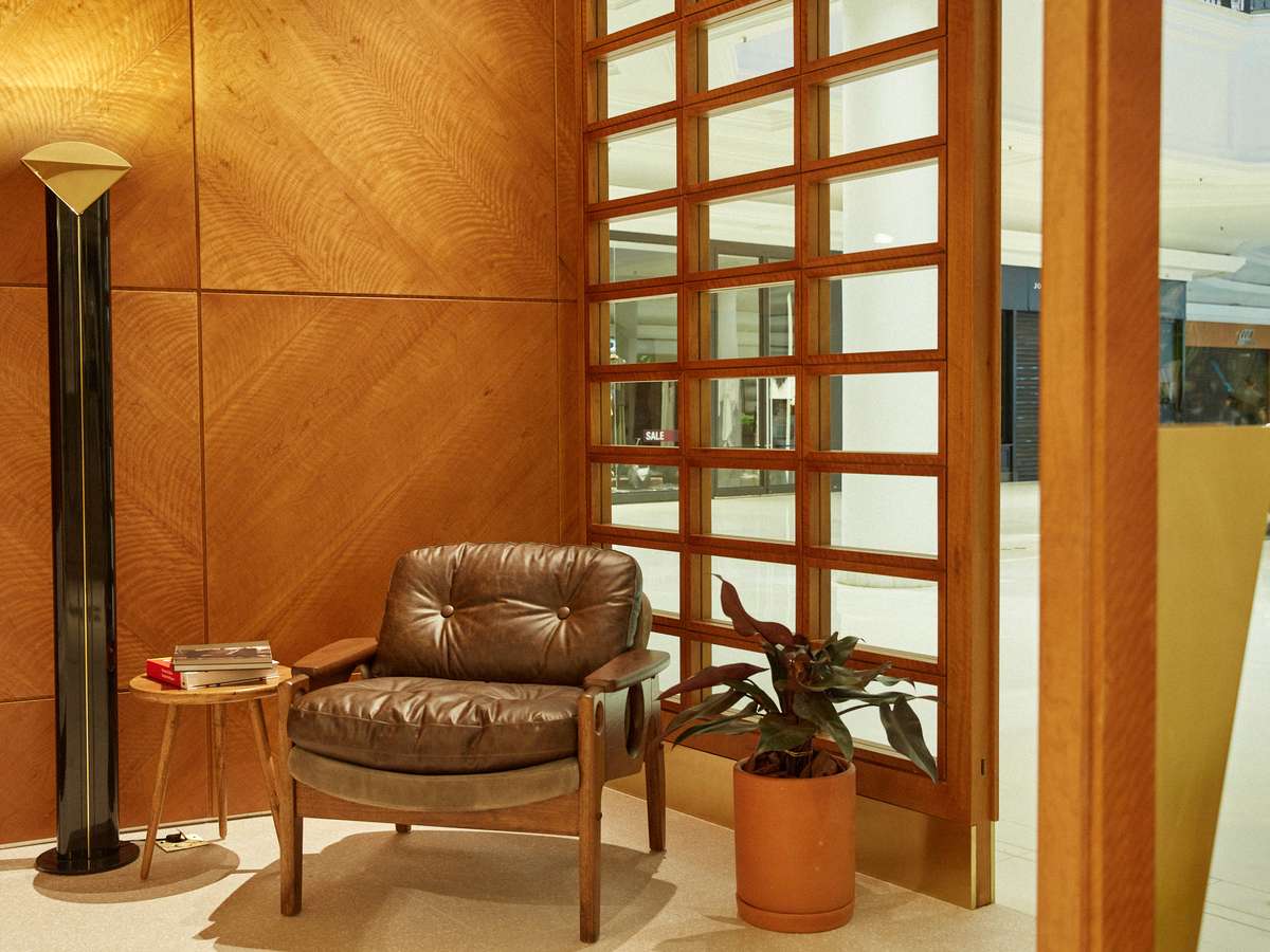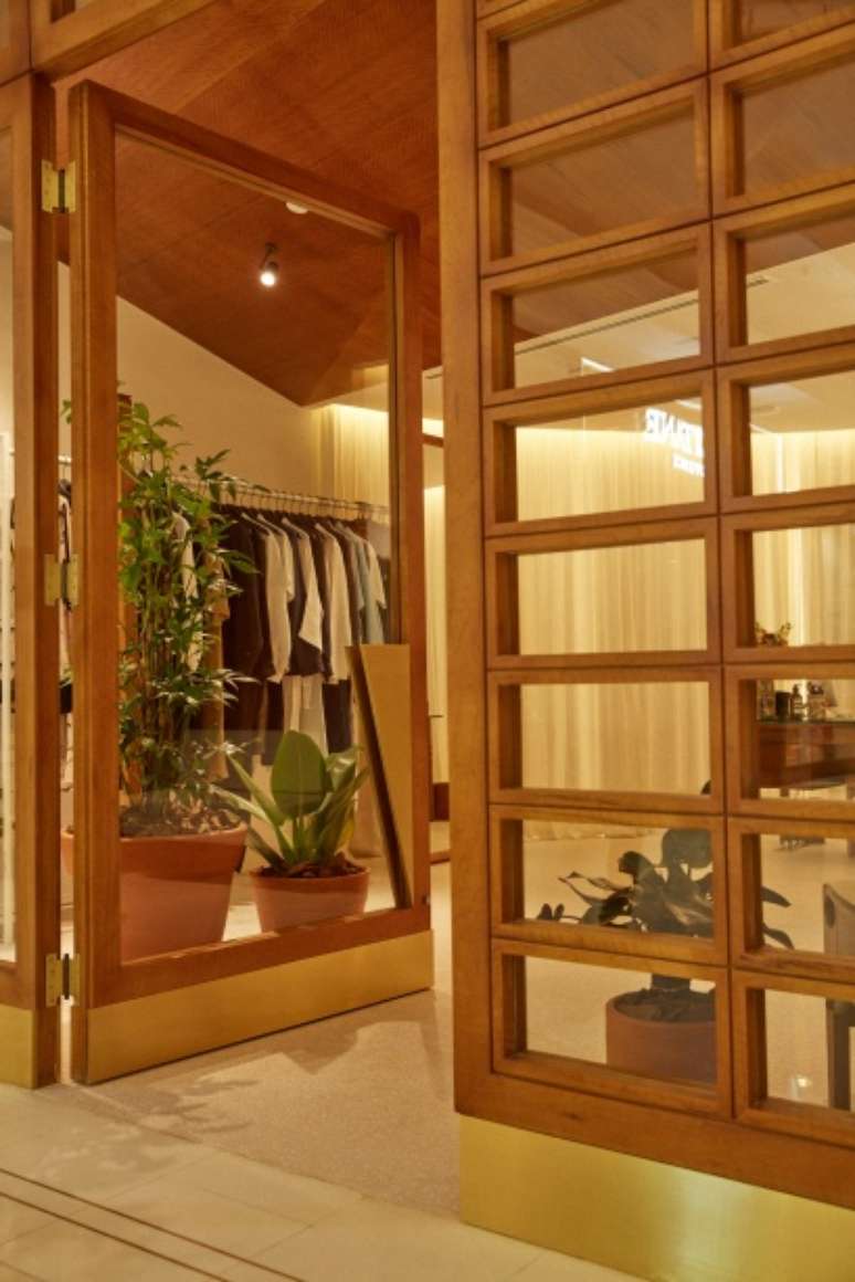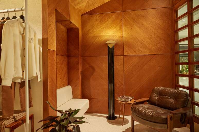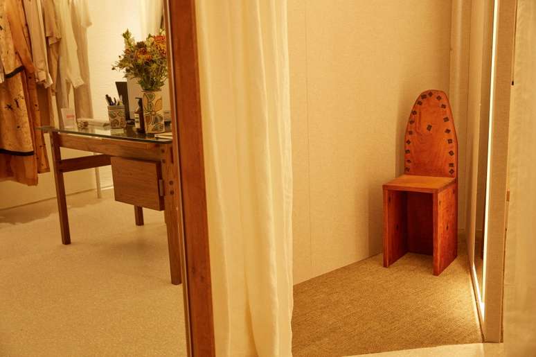 O novo ponto de venda aprofunda um diálogo com o modernismo brasileiro e seu mobiliário, tema que a marca abordará no segundo semestre de 2023. O grande destaque dos interiores são os móveis assinados por Sergio Rodrigues: logo na entrada, a icônica cadeira Tetê está sob o teto inclinado. Ao seu lado, uma luminária de latão da Dominici. Ao fundo da loja, está a cadeira Cuiabá.