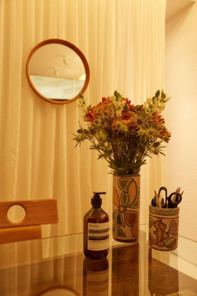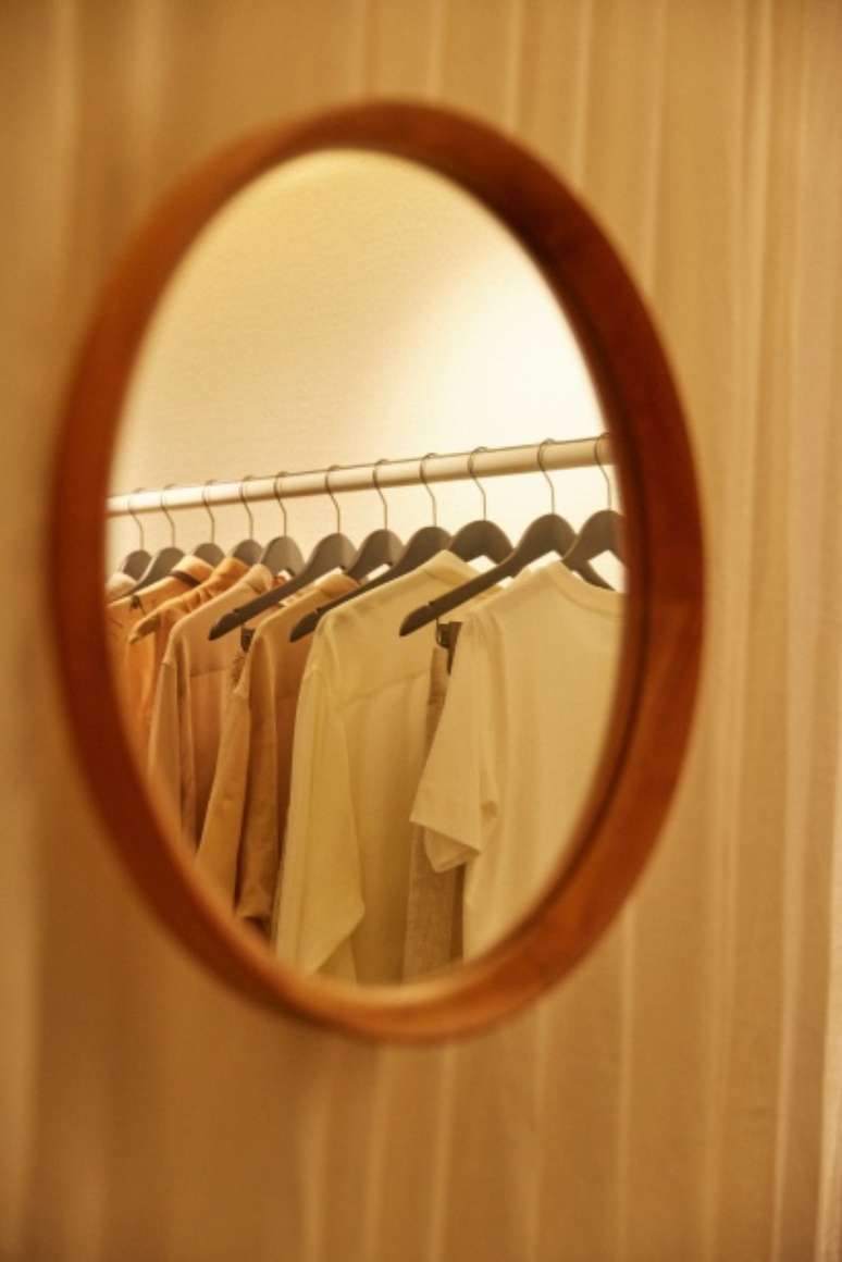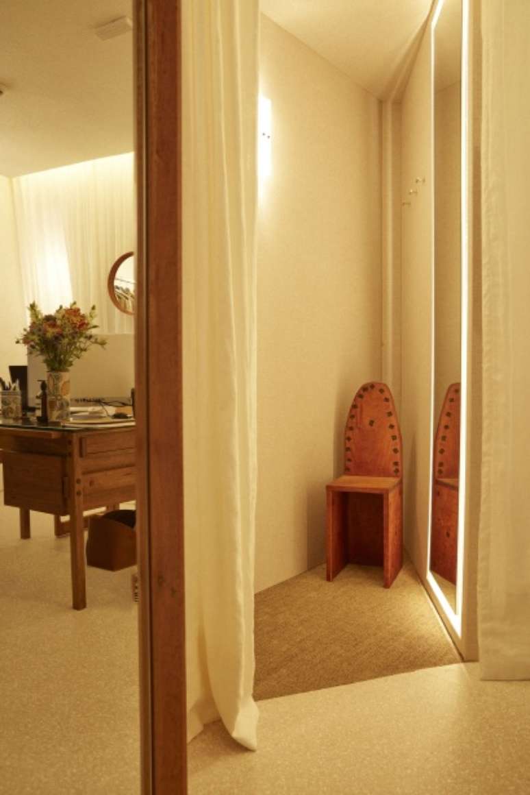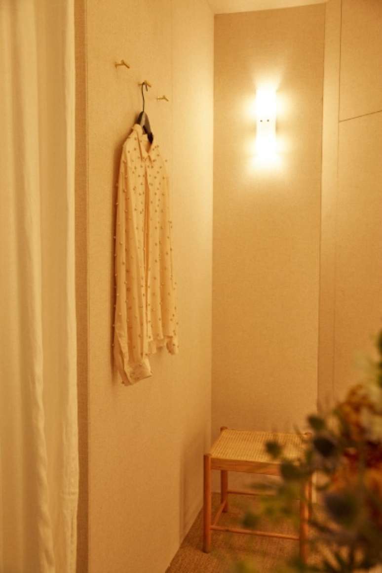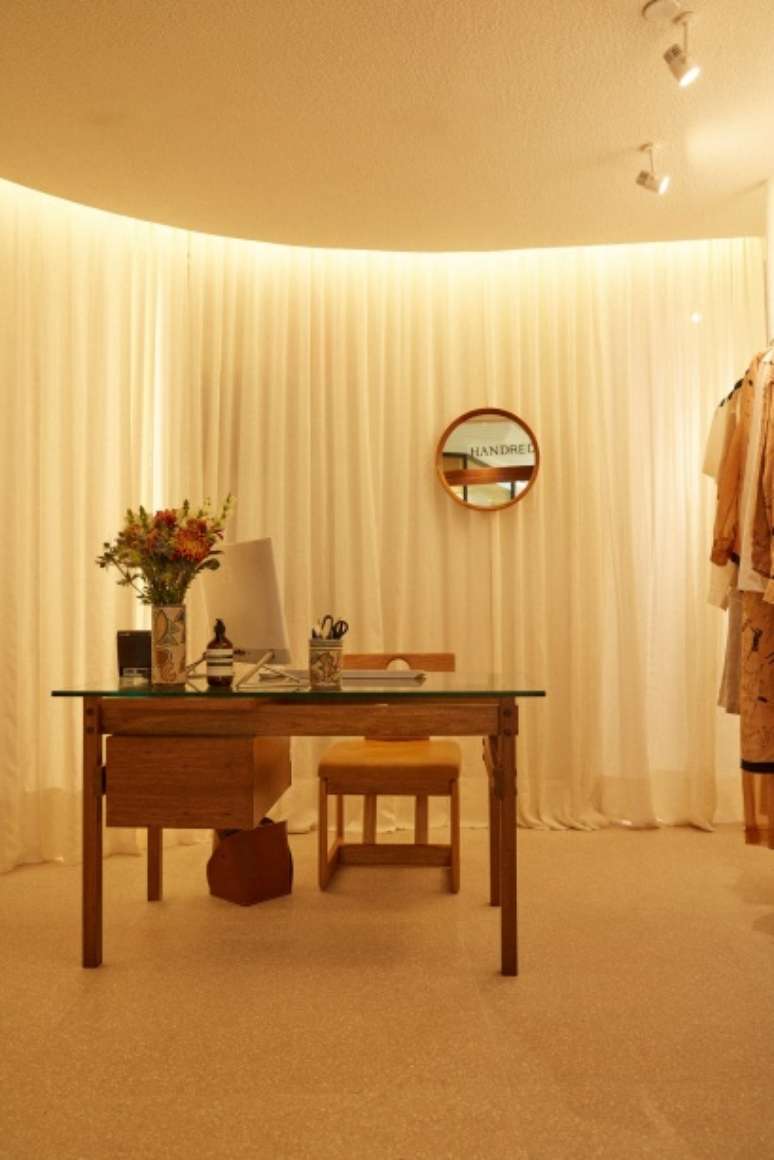 A cortina circular de linho esconde os provadores, internamente revestidos com tecido e piso de sisal, criando um diálogo entre materiais naturais e texturas. O espaço conta também com símbolos e temas caros à Handred, como cerâmicas de Francisco Brennand e uma obra de Vivian Caccuri, ambos temas de coleções anteriores, trazendo consistência às histórias que a marca conta.