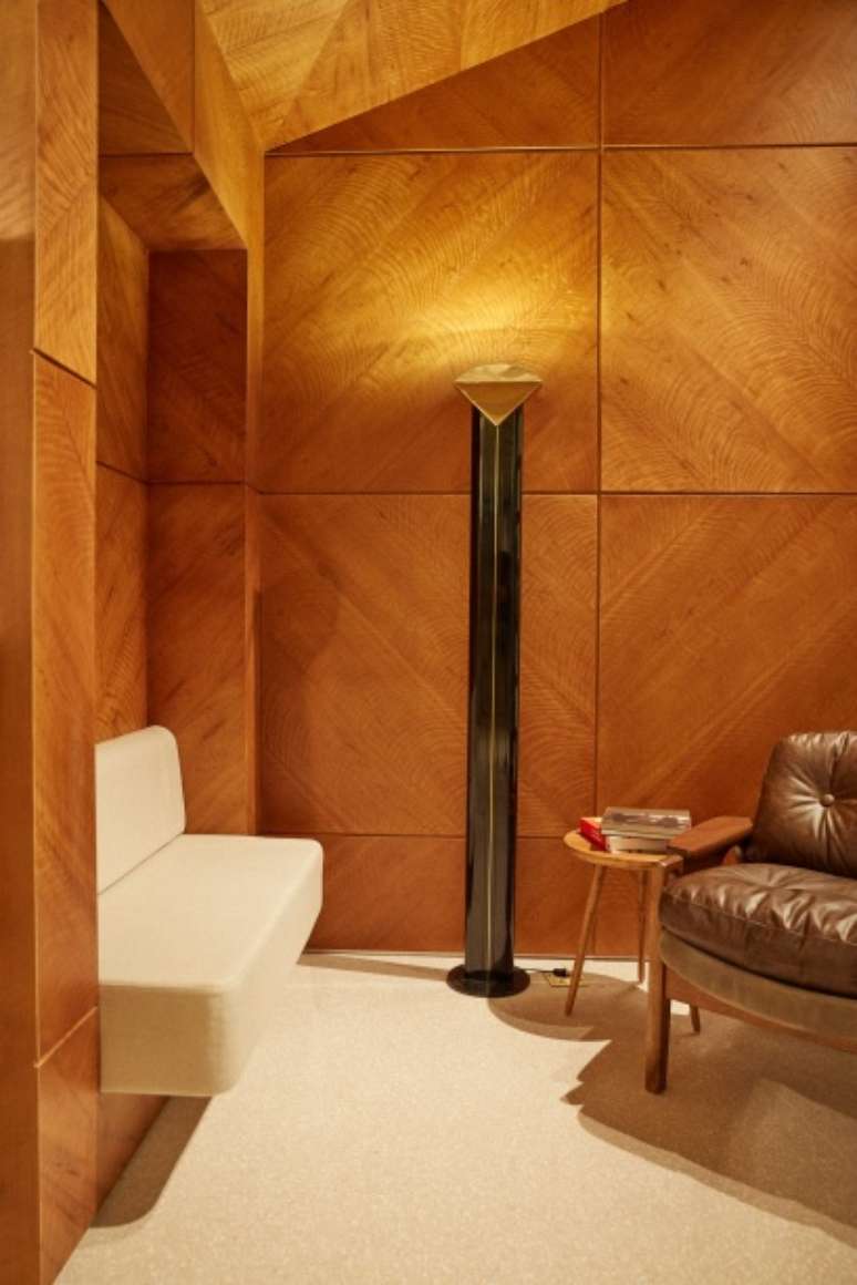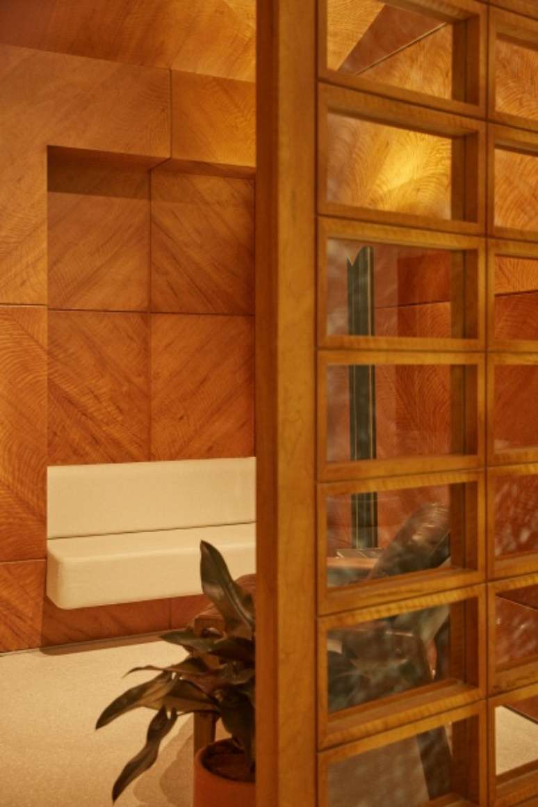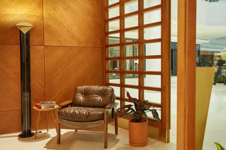 Referências Libanesas, como os painéis gráficos de imbuia nas paredes, se unem a códigos modernistas como a fachada de caixilhos, o piso de granilite e a inserção do latão no rodapé.
