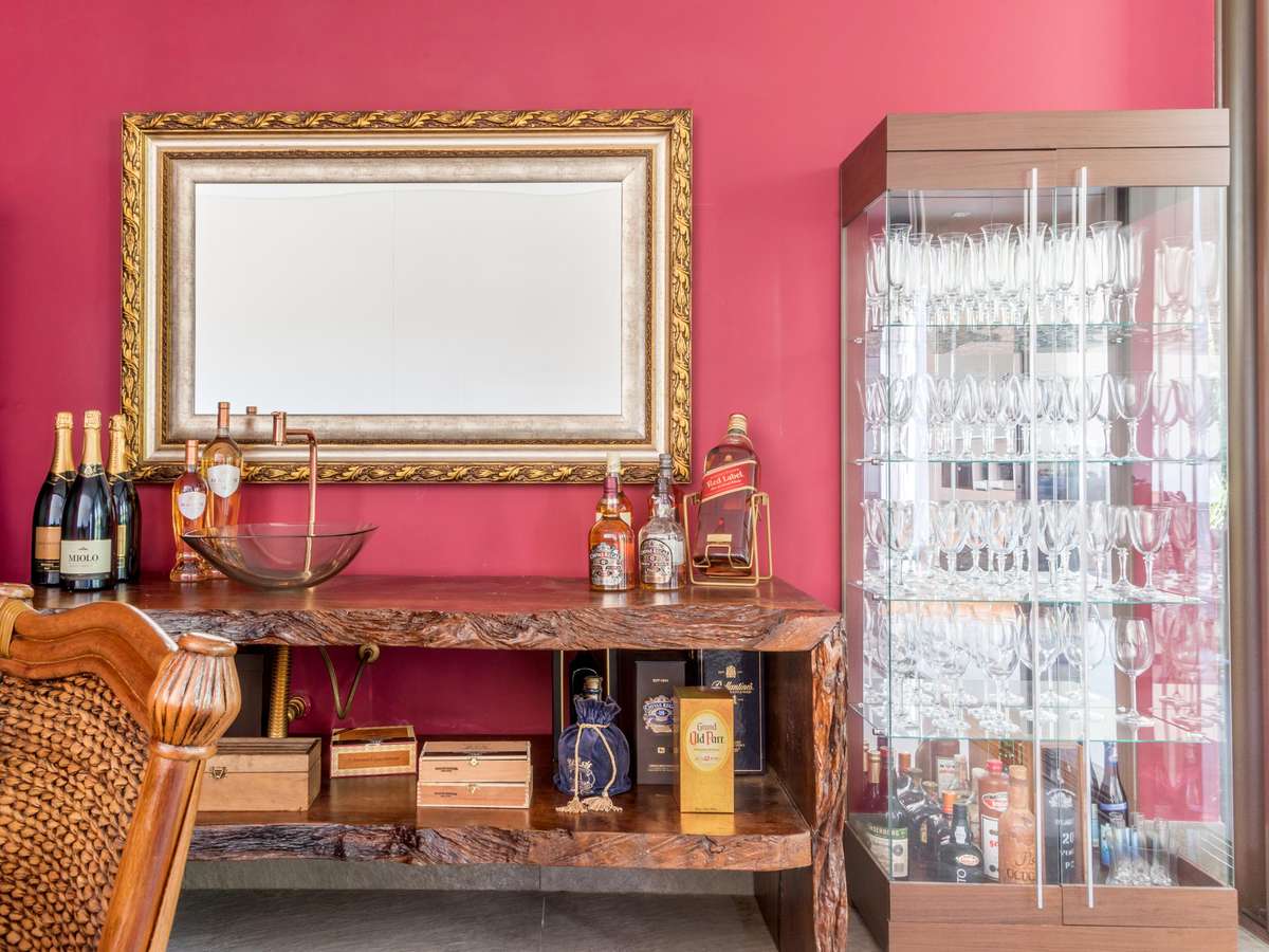 Geralmente é uma peça composta pelos mesmos armários que você tem na cozinha, luzes, espelhos embutidos, garrafa de bebidas e outros utensílios. Você pode ocultar o bar com uma porta de correr ou mantê-la visível.