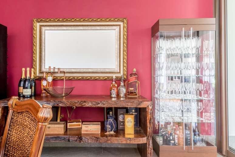 Neste projeto de Isabella Nalon, o aparador ganhou a função de cantinho do bar. Seu estilo rústico ajustou-se com a essência do décor.
