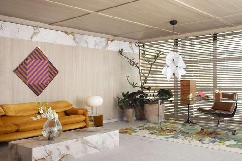 Home office de 45 m² tem estante de marcenaria e mármore e área de estar