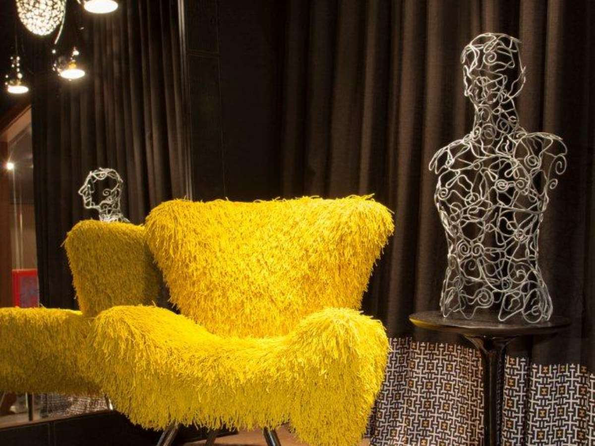 O hall, assinado pelas arquitetas Elaine Delegredo e Luciana Correa na Mostra Polo Design Show 2012, conta com poltrona amarela, espelho e escultura