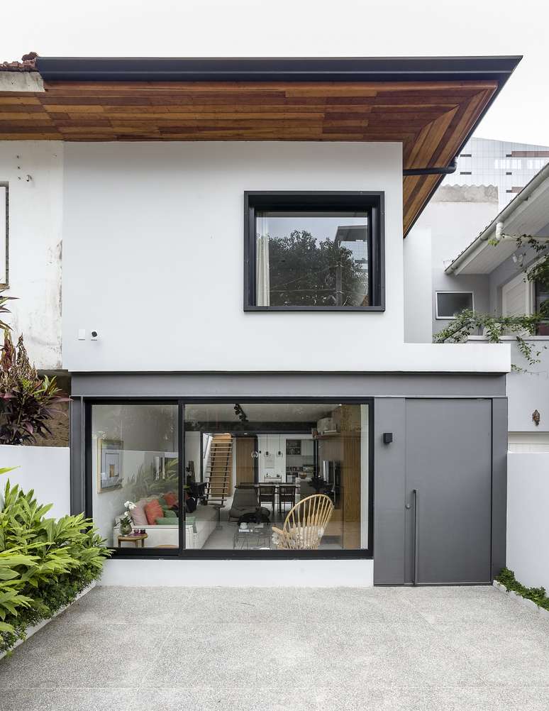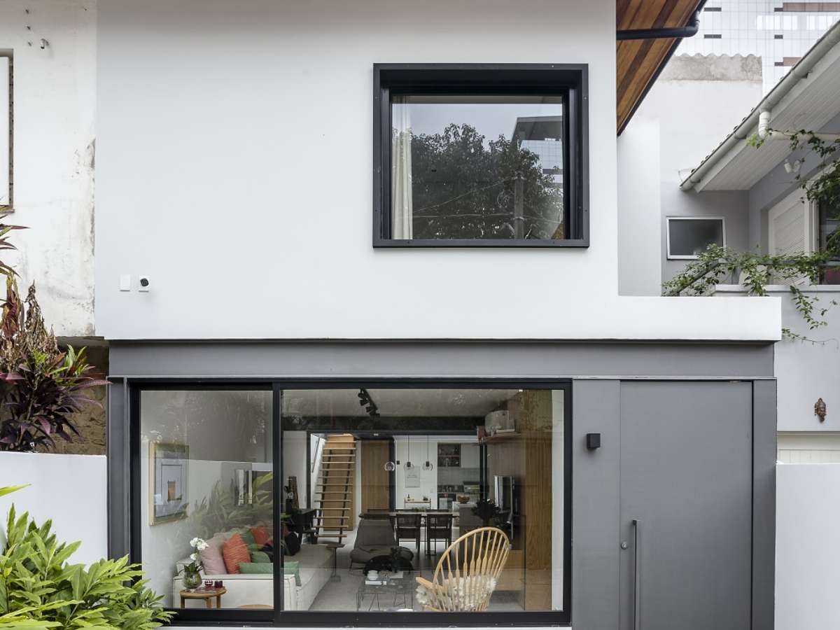 Para a integração dos ambientes, foi necessária a reformulação total da planta do imóvel de forma que a casa se tornasse geminada dos dois lados, retirando o corredor de serviço lateral e fazendo com que esse espaço se integrasse ao novo layout.