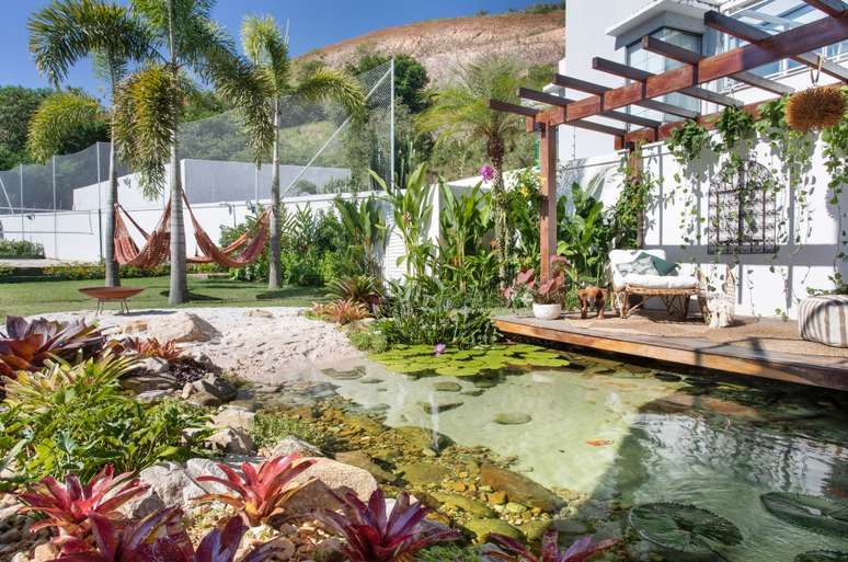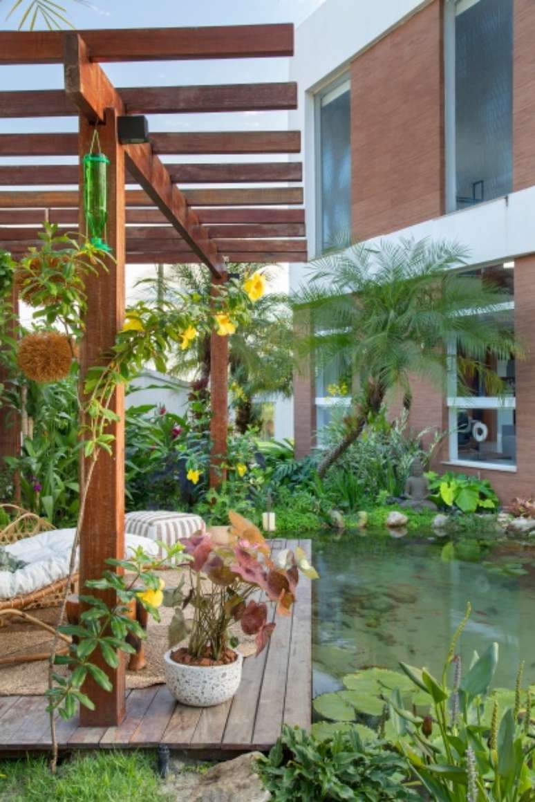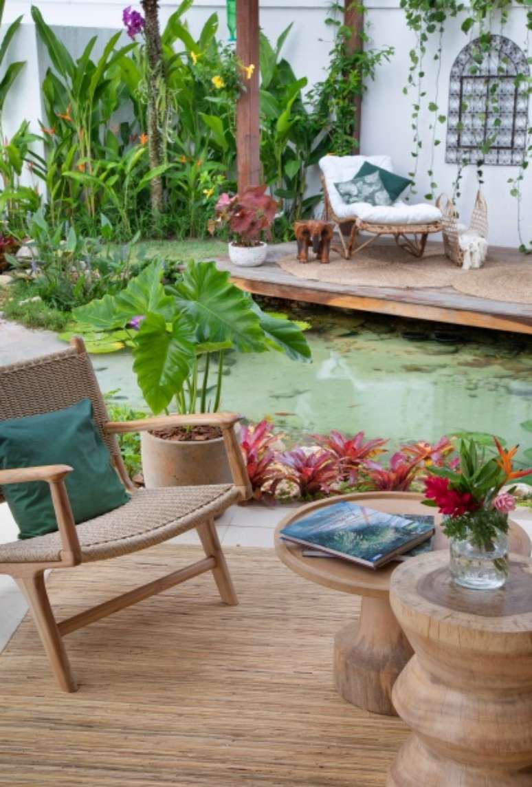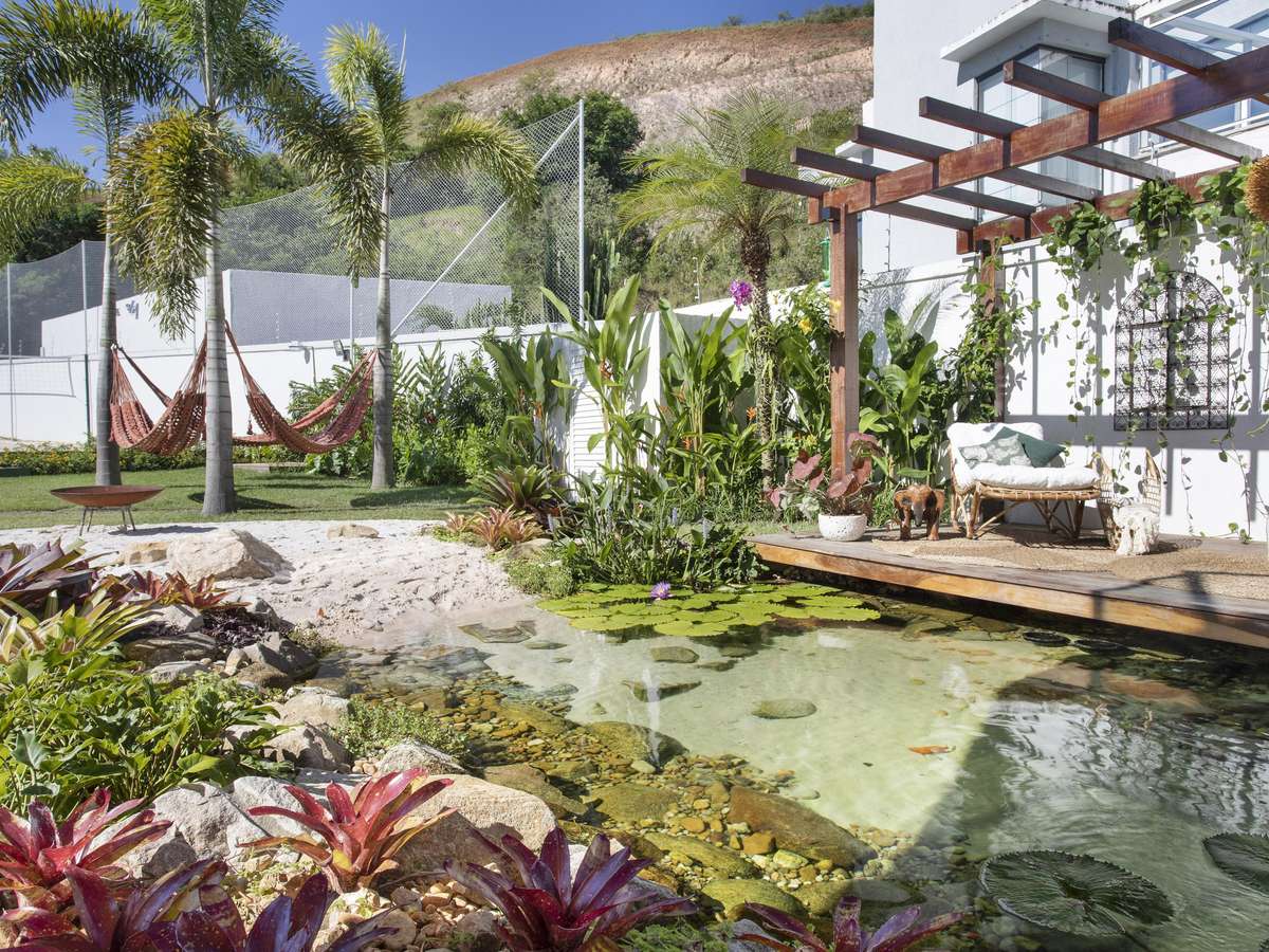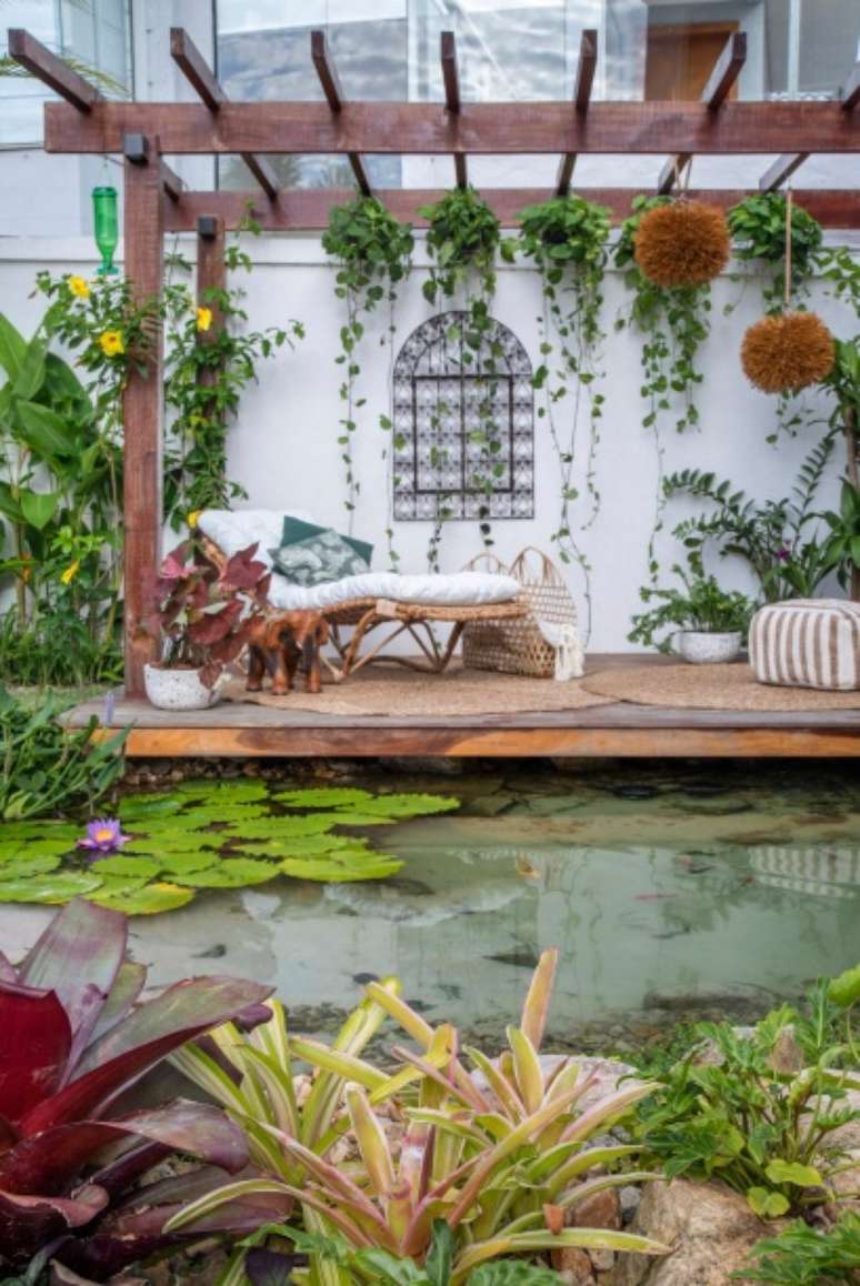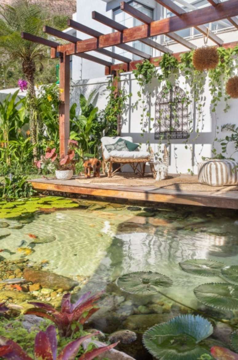 Jardim tropical de 900m² tem lago de peixes, pergolado e horta