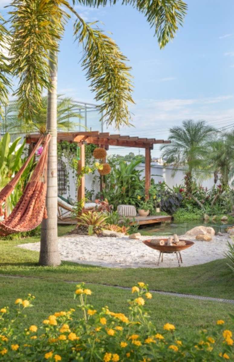 Ao final, o projeto de paisagismo foi inspirado nos jardins tropicais, repleto de espécies nativas de baixa manutenção, com direito a pomar, horta, redário, gramado, lago com praia de areia branca, pergolado construído do zero, chuveirão com deck, varanda coberta ambientada e quadra esportiva de areia.