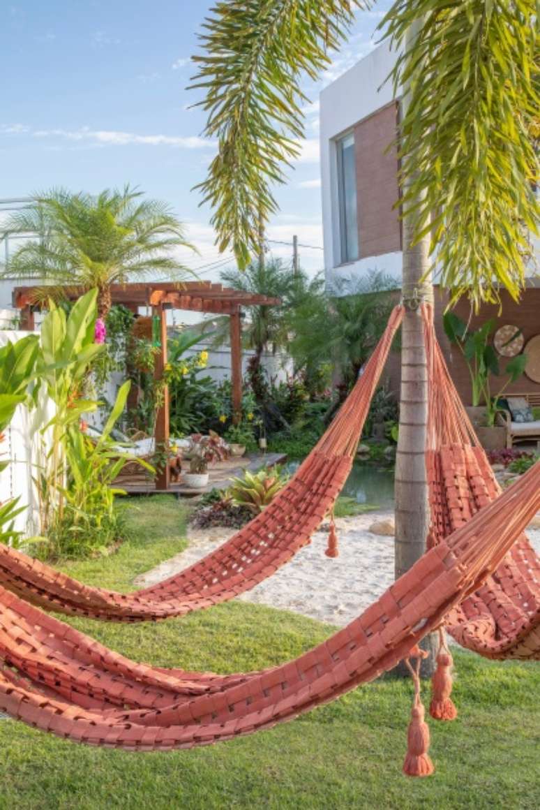 Com altura média de 6m, as três palmeiras Rabo-de-Raposa que delimitam o espaço do redário foram escolhidas e plantadas equidistantes, já considerando a função que teriam na área externa. As três redes foram produzidas com fios de garrafa PET num tom coral, fornecidas pela Santa Luzia Redes e Decoração. Já o pergolado e a varanda coberta foram ambientados com móveis, adornos, luminárias e tapetes de materiais naturais (como fibra, madeira e algodão), fornecidos pelas lojas Hábito, Casa Ocre, Organne Vasos e Inove iluminação.