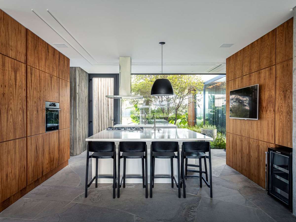 No térreo, todos os caminhos levam às ensolaradas varandas do grande living, com cozinha integrada, e da suíte principal, que se abrem sobre o pátio e a piscina.