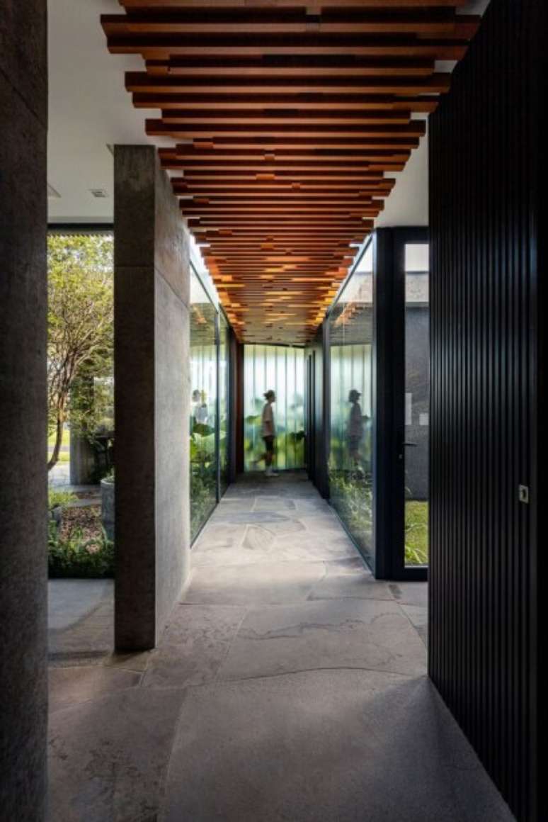 Do hall, uma pérgola de madeira cumaru, coberta por vidro entre dois outros jardins, conduz quem adentra ao volume principal da residência. Os jardins, protegidos do vento, possibilitam o cultivo de ervas e temperos que abastecem a cozinha e frutos que fazem a alegria dos pássaros e da moradora.