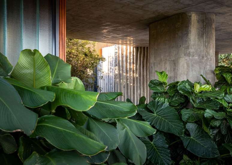 O primeiro jardim, externo, ocorre junto ao passeio. Ele é imediatamente seguido por um semi-interno, sob o vazado da marquise da fachada, que acolhe o visitante e dá privacidade ao hall de entrada, escritório e lavabo.