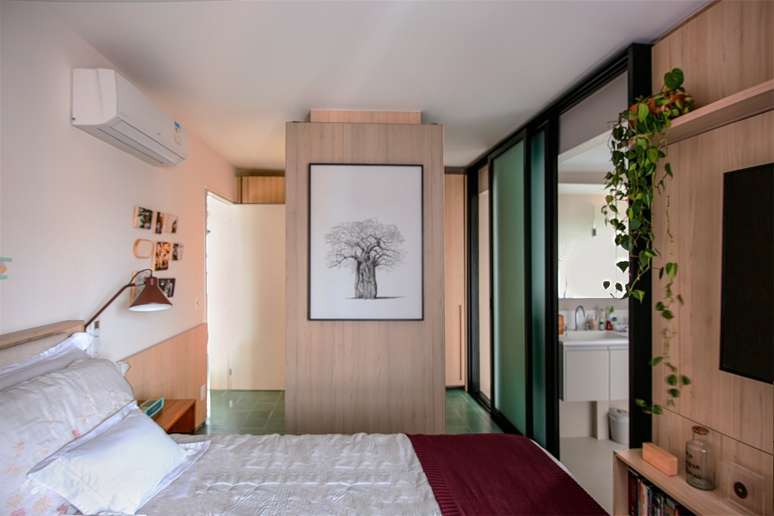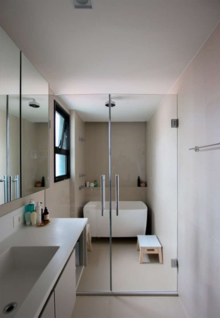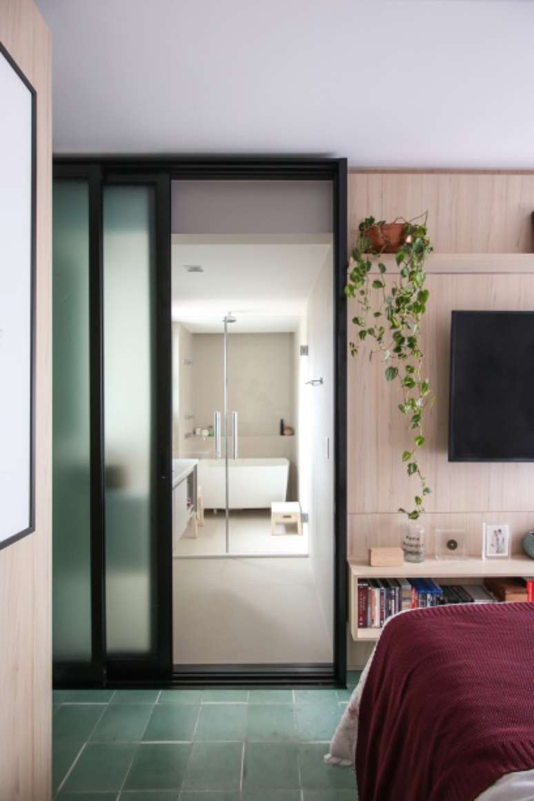 Na suíte principal, um banheiro comum e um pequeno spa são reservados para momentos de relaxamento da família. O espaço pode ser conectado e isolado através de uma porta de correr piso-teto com vidro fosco, que possibilita maior amplitude ao quarto ou mais privacidade ao ambiente.