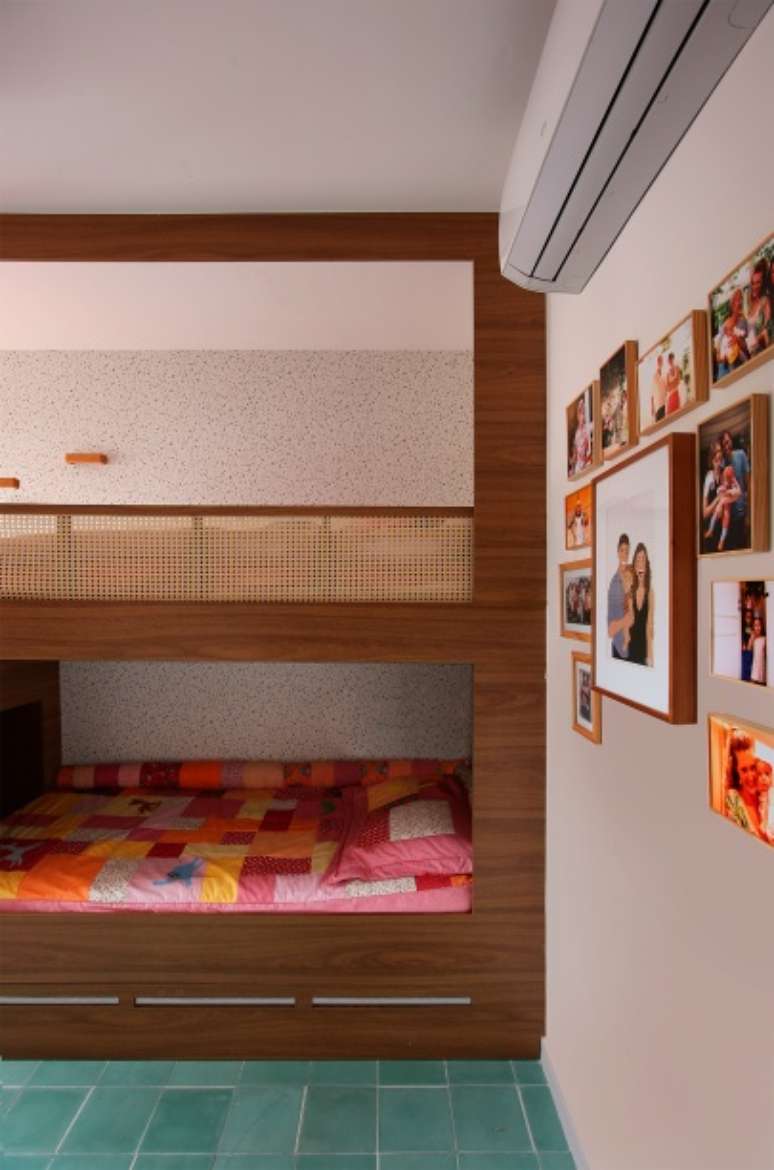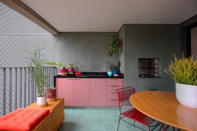 Assinado pelo Studio MEMM, o projeto também ganha personalidade com cozinha que mescla piso verde e armários rosas