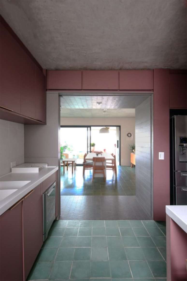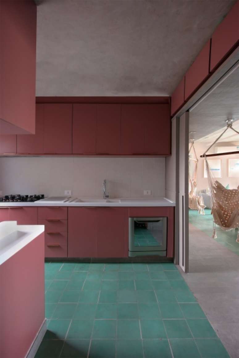 A cozinha é marcada pelo contraste artístico e mescla de cores entre o piso em ladrilhos hidráulicos verdes e os armários de madeira revestida em fórmica de tom rosa queimado.