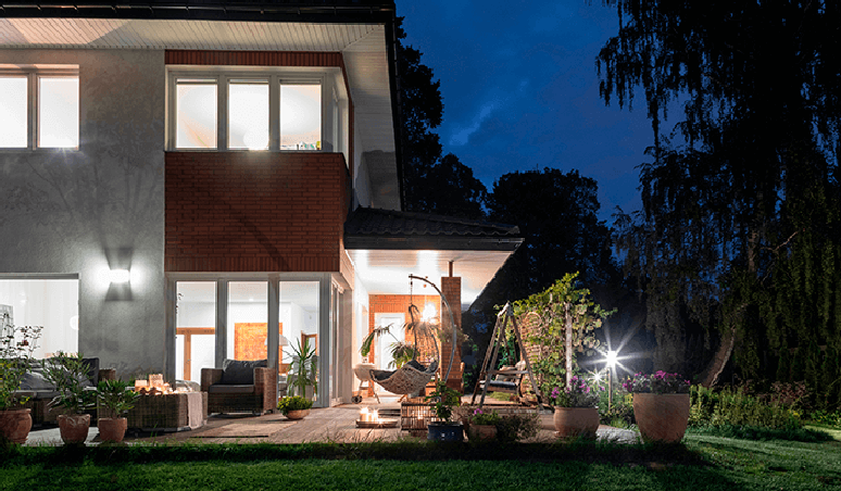 Para ter um ambiente aconchegante e relaxante, prefira as lâmpadas quentes na sua luminária externa led. Já as lâmpadas frias são energizantes e aumentam o foco.