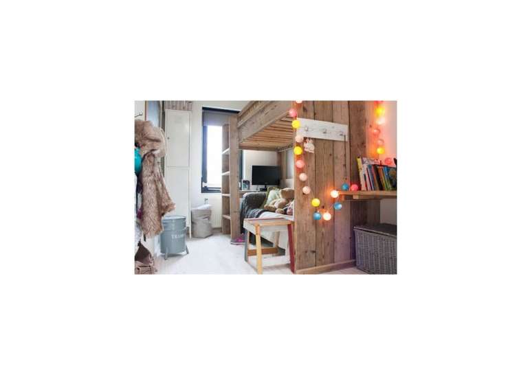 Quarto com beliche de madeira decorada com luzes coloridas.