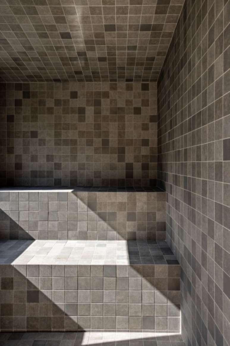 O volume da sauna delimita o espaço da piscina através de um bloco de madeira que se prolonga para o sofá. A piscina e os degraus de acesso são sobrepostos a esse deck em volumes monolíticos em pedra.