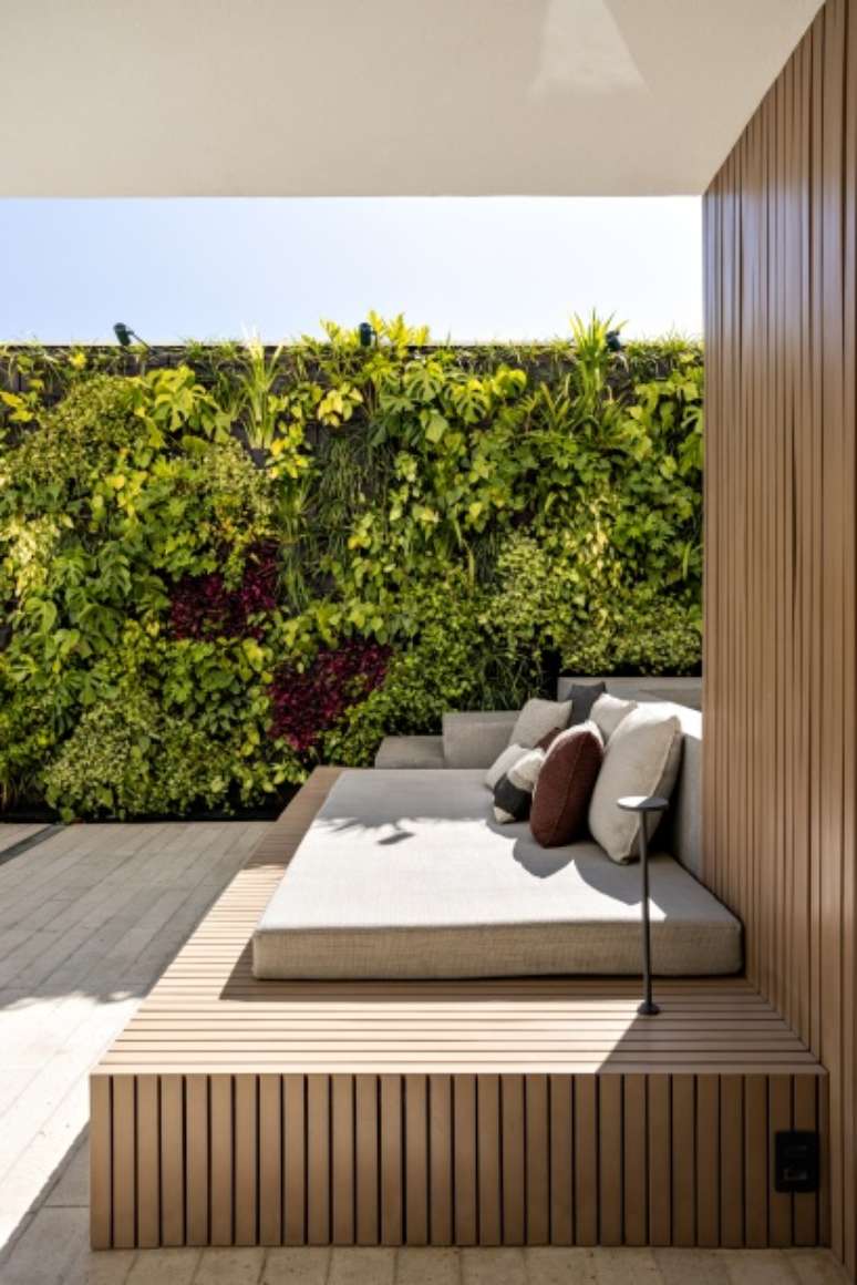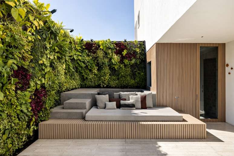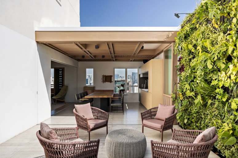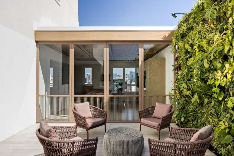 Ainda nesse pavimento, a área externa do apartamento também foi totalmente modificada: duas janelas existentes foram cobertas para permitir a implantação de um jardim vertical, que ao cobrir todas as paredes cria um plano único que abraça o ambiente que traz a sensação de refúgio urbano para o apartamento. A reformulação deste espaço pôde abrigar além da piscina, um novo estar e uma sauna.