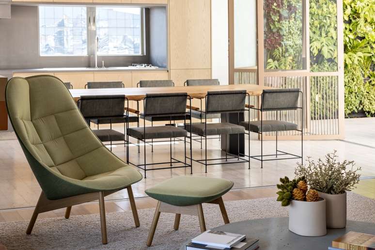 Na cozinha, a escolha do ladrilho verde para o revestimento do piso e meia parede dialoga com a marcenaria em laca de tom semelhante. Já nos mobiliários, brincamos com contrastes entre diferentes texturas e cores, que aparecem pontualmente no sofá Benjamin, do De Carvalho e na poltrona Uchiwa da HAY.