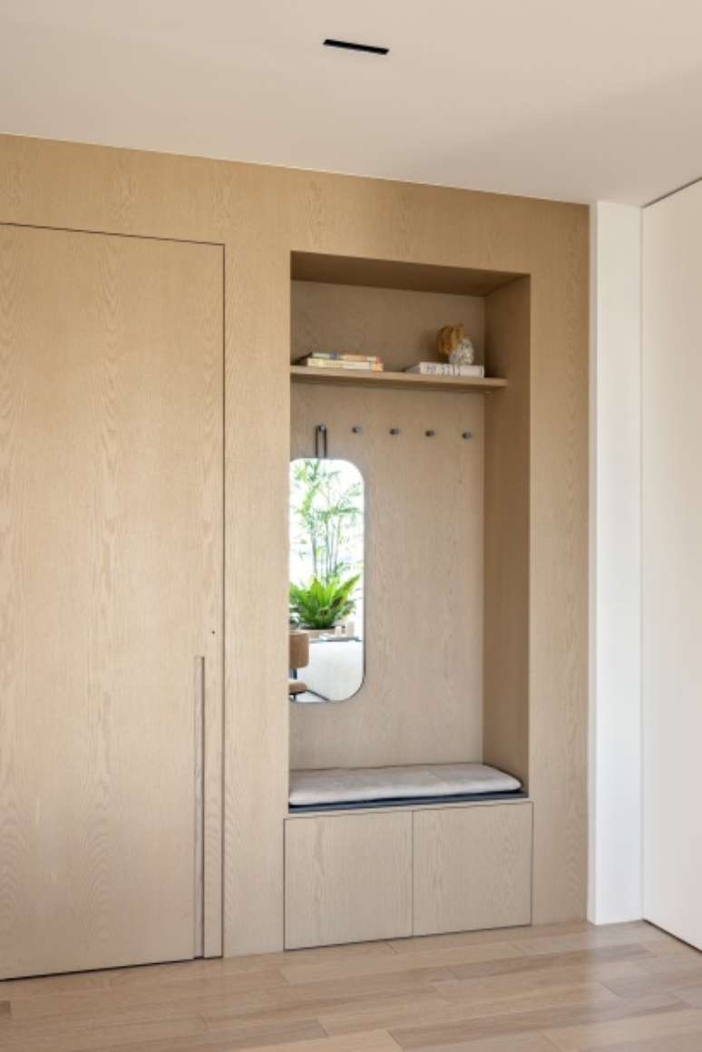 Antes, o apartamento era escuro, com revestimentos pesados, e sua disposição não valorizava a vista. A principal alteração do pavimento térreo foi a reconfiguração da escada e entrada social. A porta de acesso do hall social limitava o layout e escancarava a parte social de forma indesejada. Sua inversão possibilitou um respiro que recebe gentilmente os moradores e organiza os fluxos e funções, abrigando a chapelaria e o lavabo.