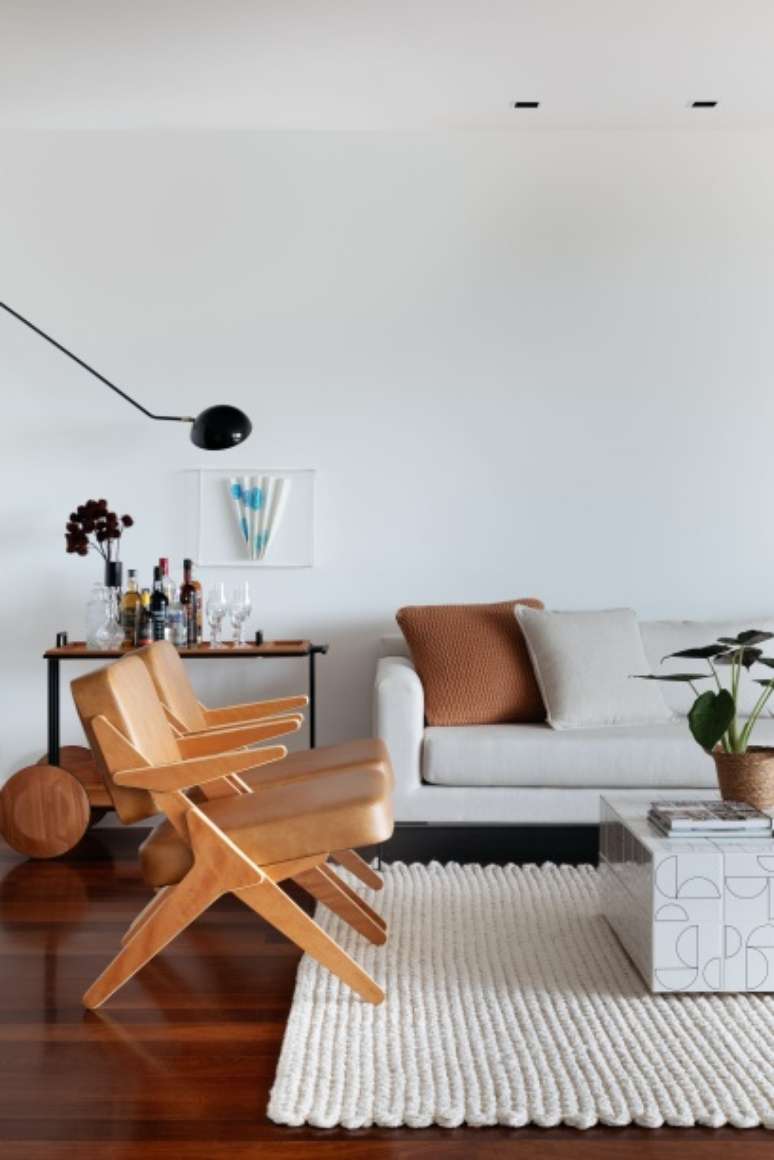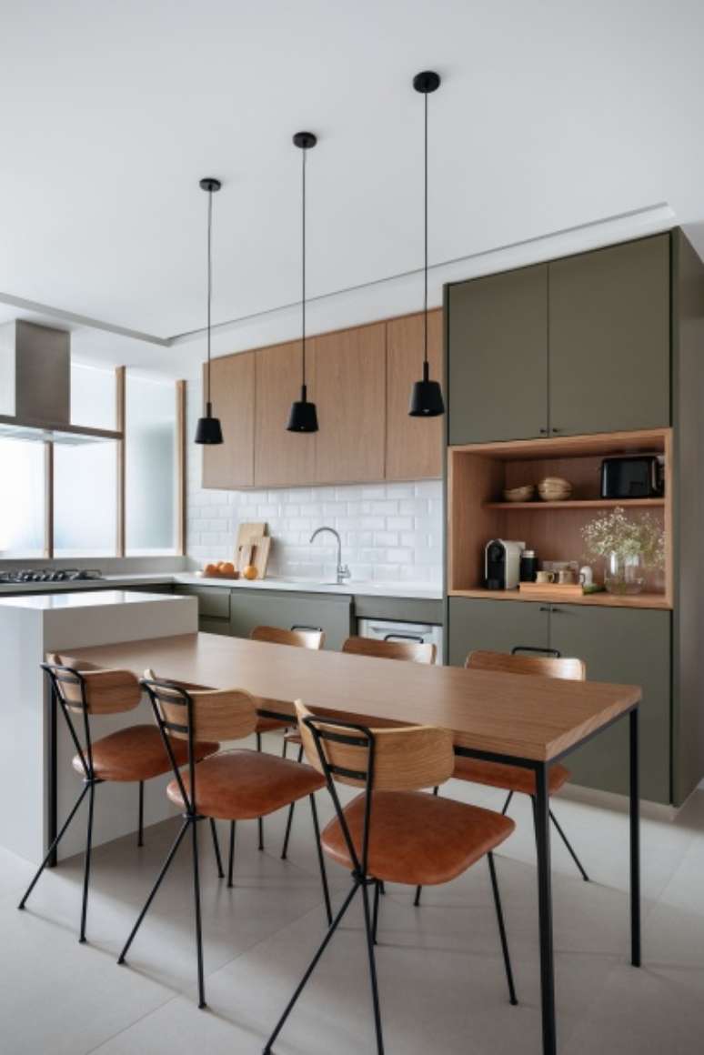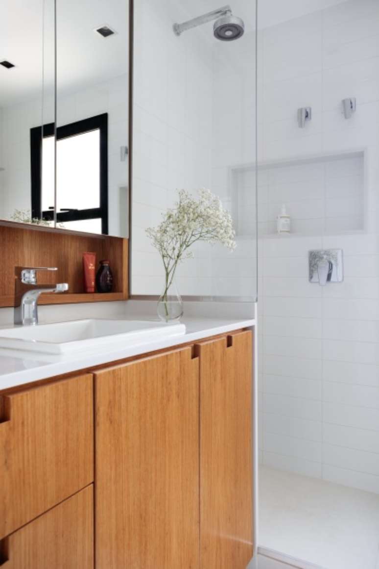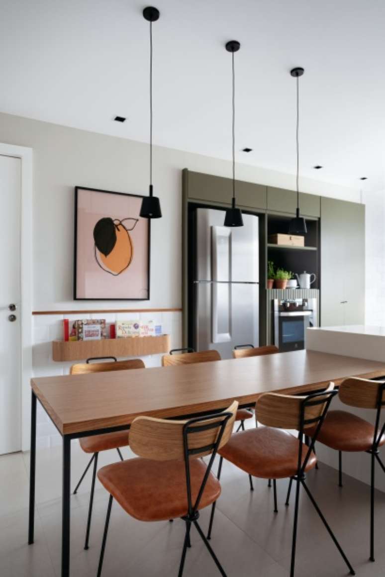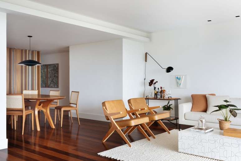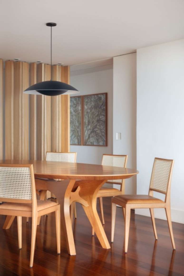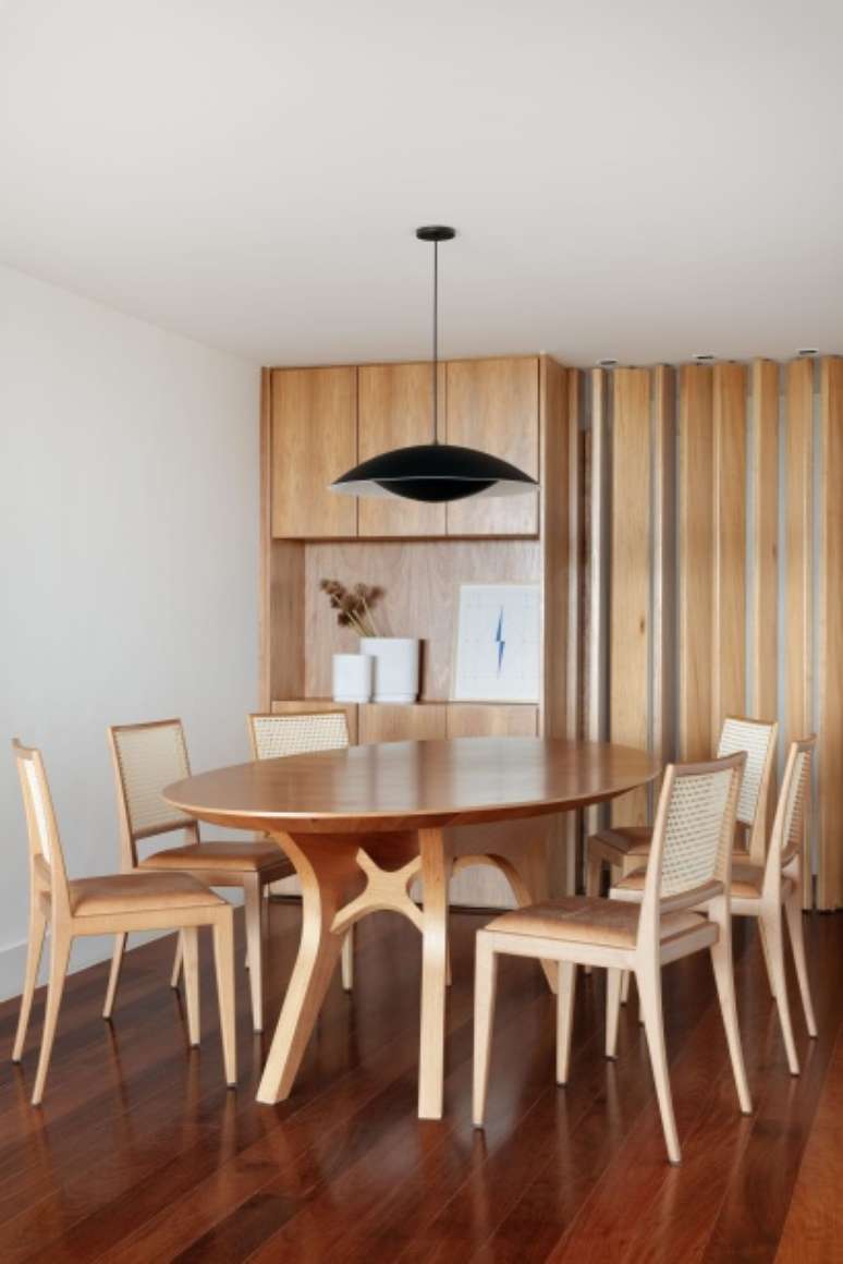 Entre os destaques do projeto, os arquitetos ressaltam a marcenaria da sala de jantar (brise articulado e porta de correr), que possibilita uma integração visual da circulação com a sala e deixa os dois ambientes mais charmosos;