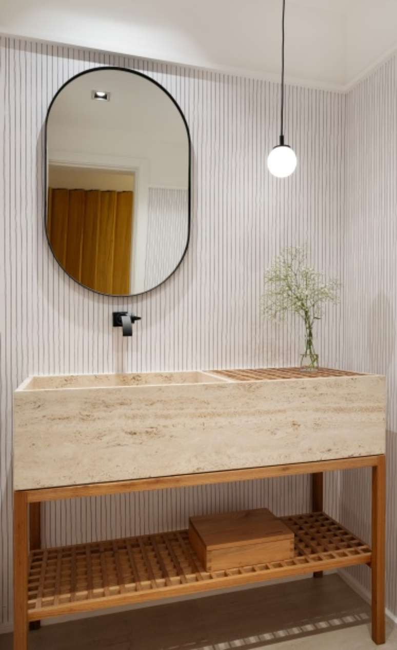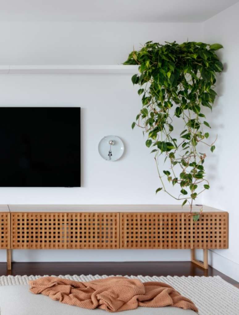 A mesa de centro, desenhada pelo escritório, revestida com azulejos de estampa geométrica, da Mica; o uso de dois tapetes naturais, iguais e claros, na área do estar e da tv, trazendo leveza para esses ambientes; o lavabo com uma parte da bancada e a prateleira inferior em muxarabi de freijó, repetindo o mesmo padrão usado na sala, nas portas do móvel da tv;
