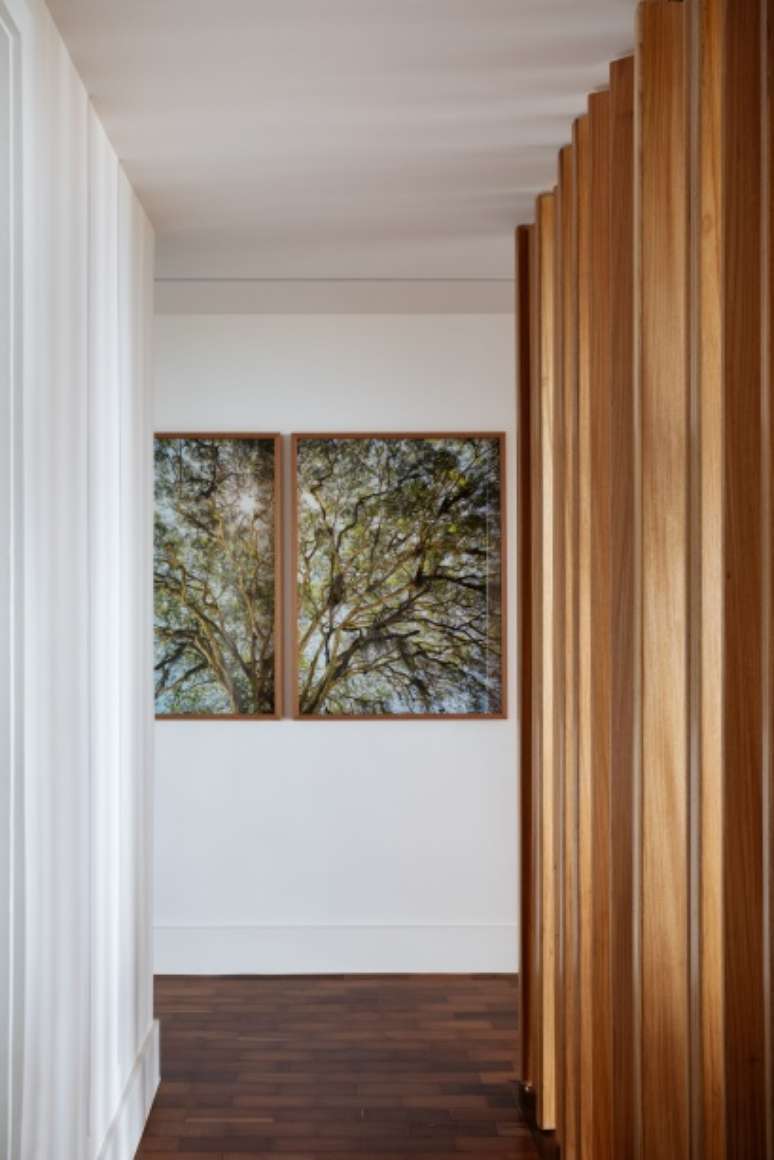 Os arquitetos revelam ainda que a maior modificação na planta foi a integração visual da circulação do apartamento com a sala, feita através de brises de madeira e da porta de correr, com 2,10m de largura.